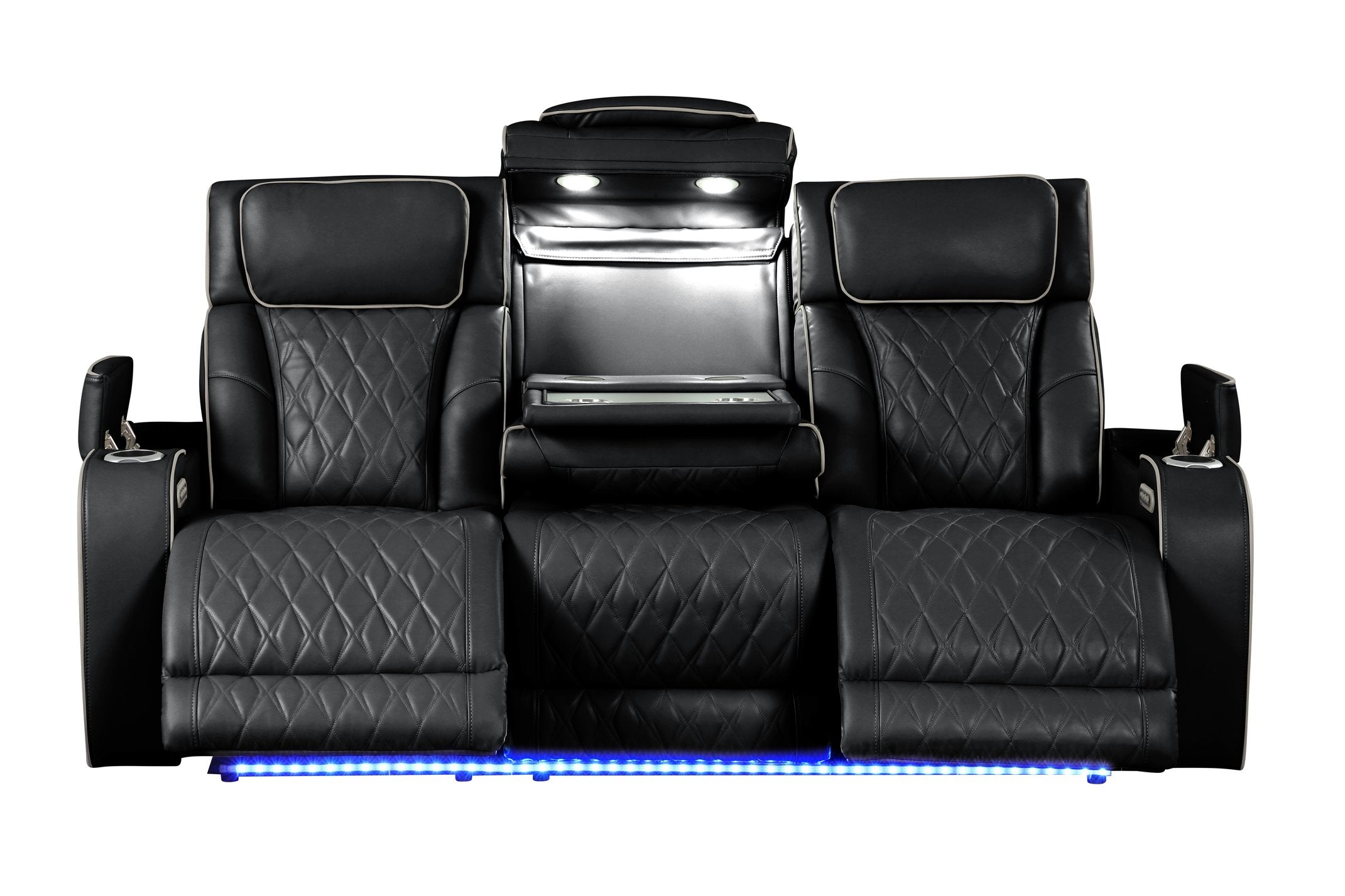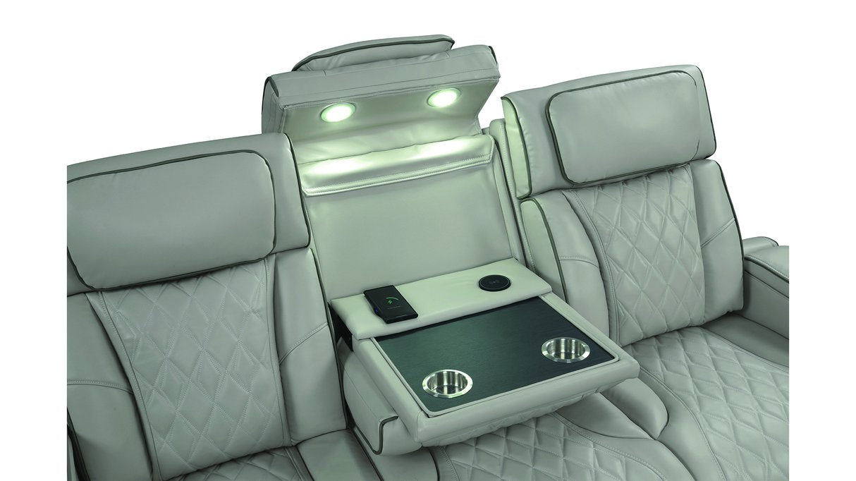 - The sofa features a fold-down center console with wireless charging, cup holders, and reading lights.