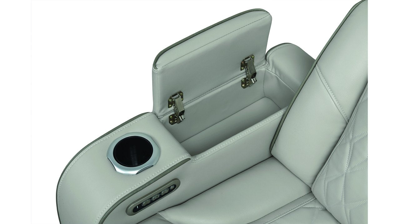 - The loveseat includes built-in Bluetooth speakers, along with hidden storage compartments and USB ports in the armrests.