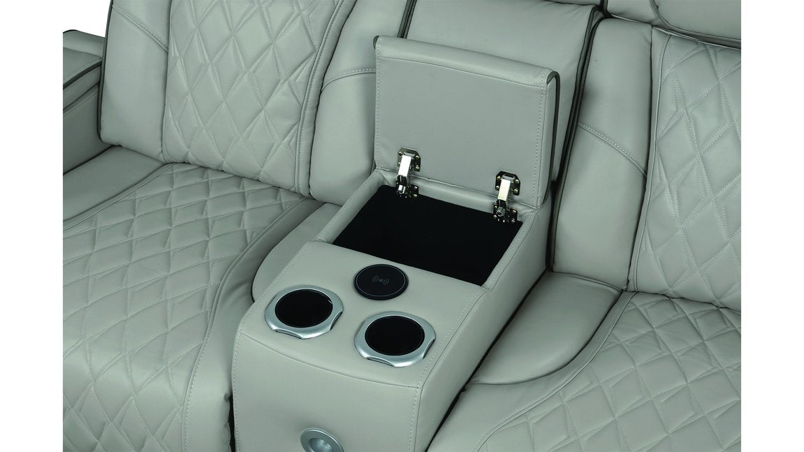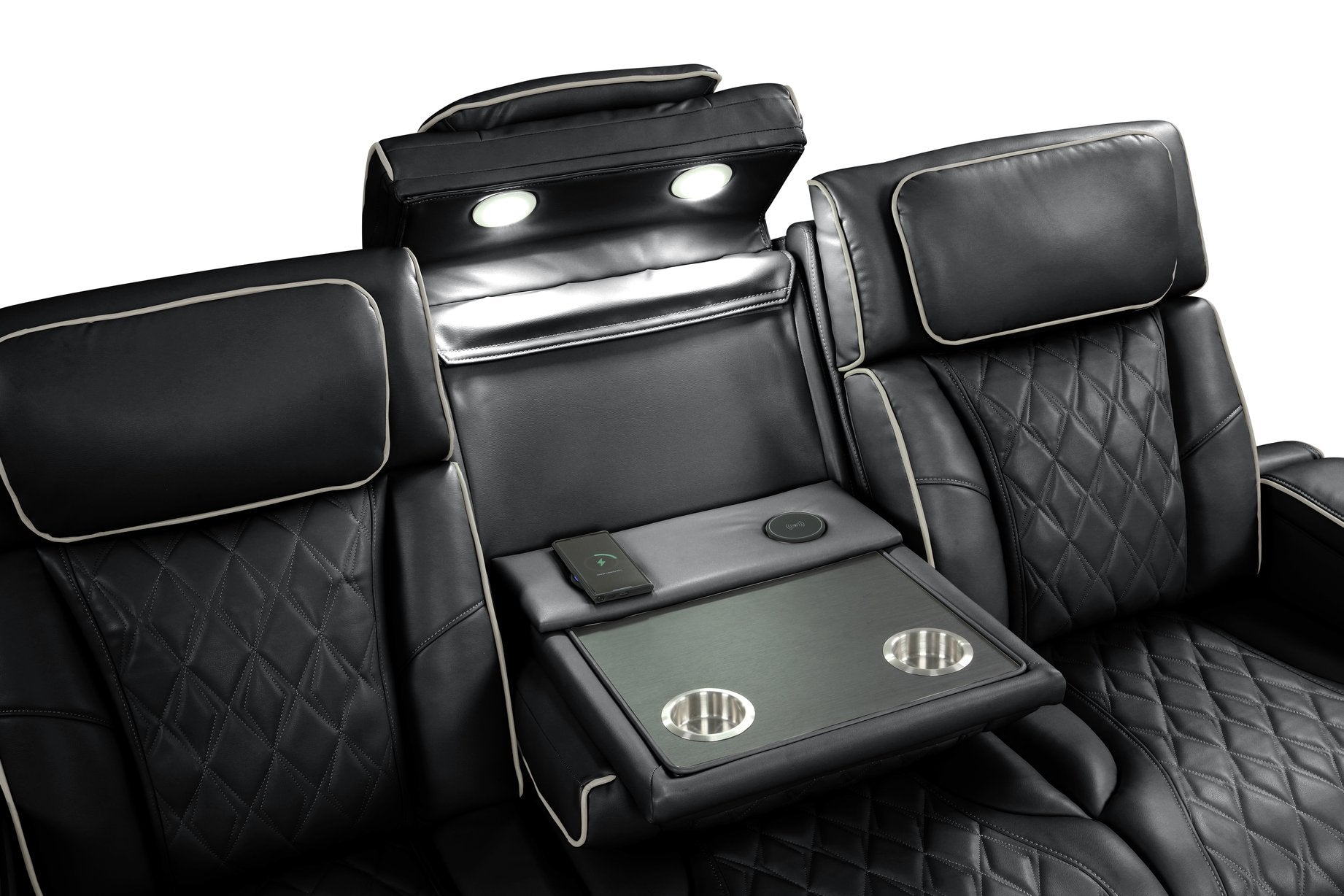 - Sofa features: Fold-down center console with wireless charging pad, dual cup holders, and built-in reading lights; power foot and head recline mechanisms; diamond-stitched backrests; base and side LED lighting.