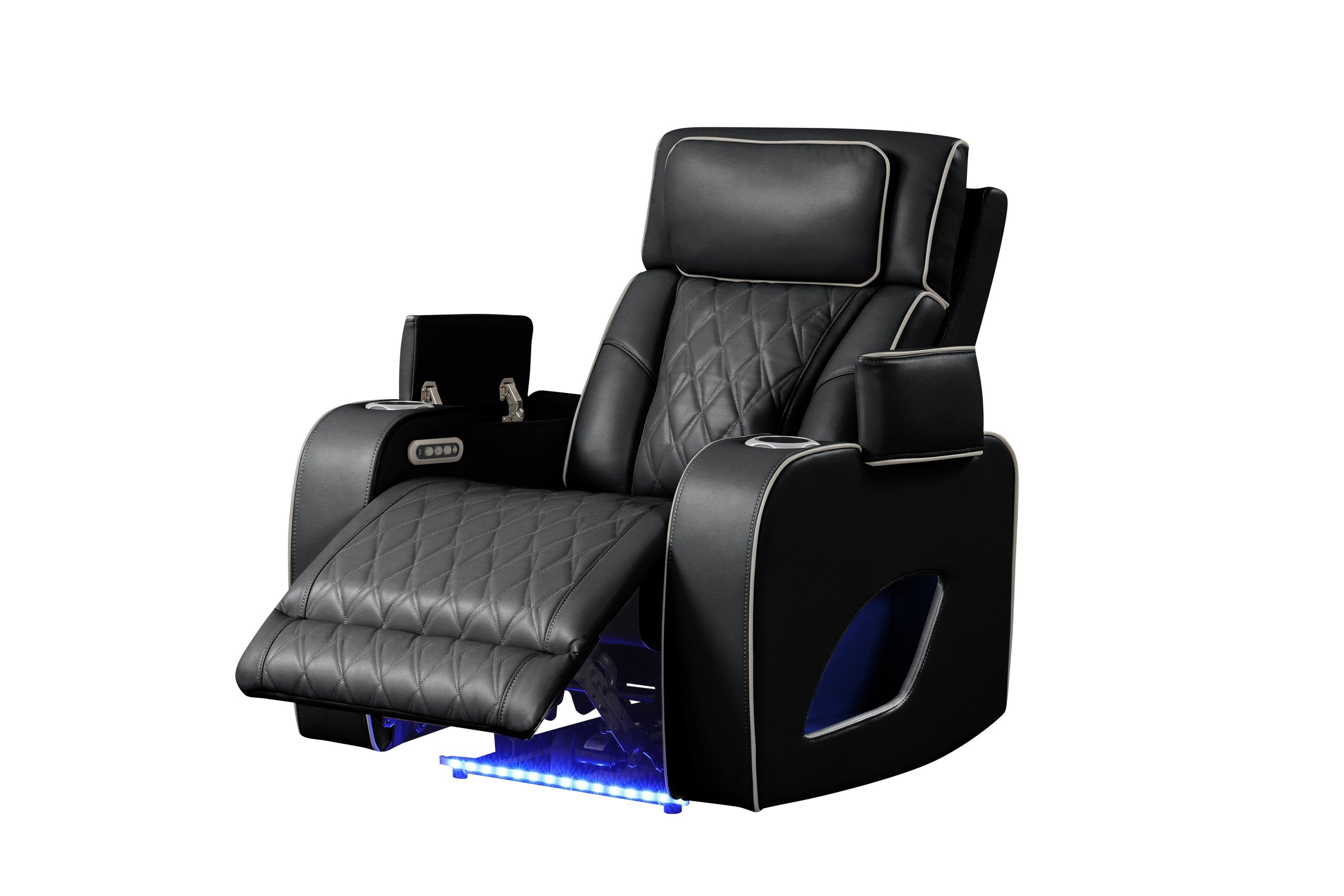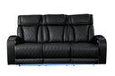 Elevate your living room with this modern 3-piece reclining set that blends contemporary styling with advanced comfort features. Upholstered in durable high-performance faux leather and finished in classic black, the set is tailored with diamond-stitched backrests and integrated lighting for a refined, high-tech look. Thoughtful conveniences—like power reclining, massage functions, built-in audio, and multi-purpose consoles—make this group ideal for everyday relaxation, entertaining, and home theater use.