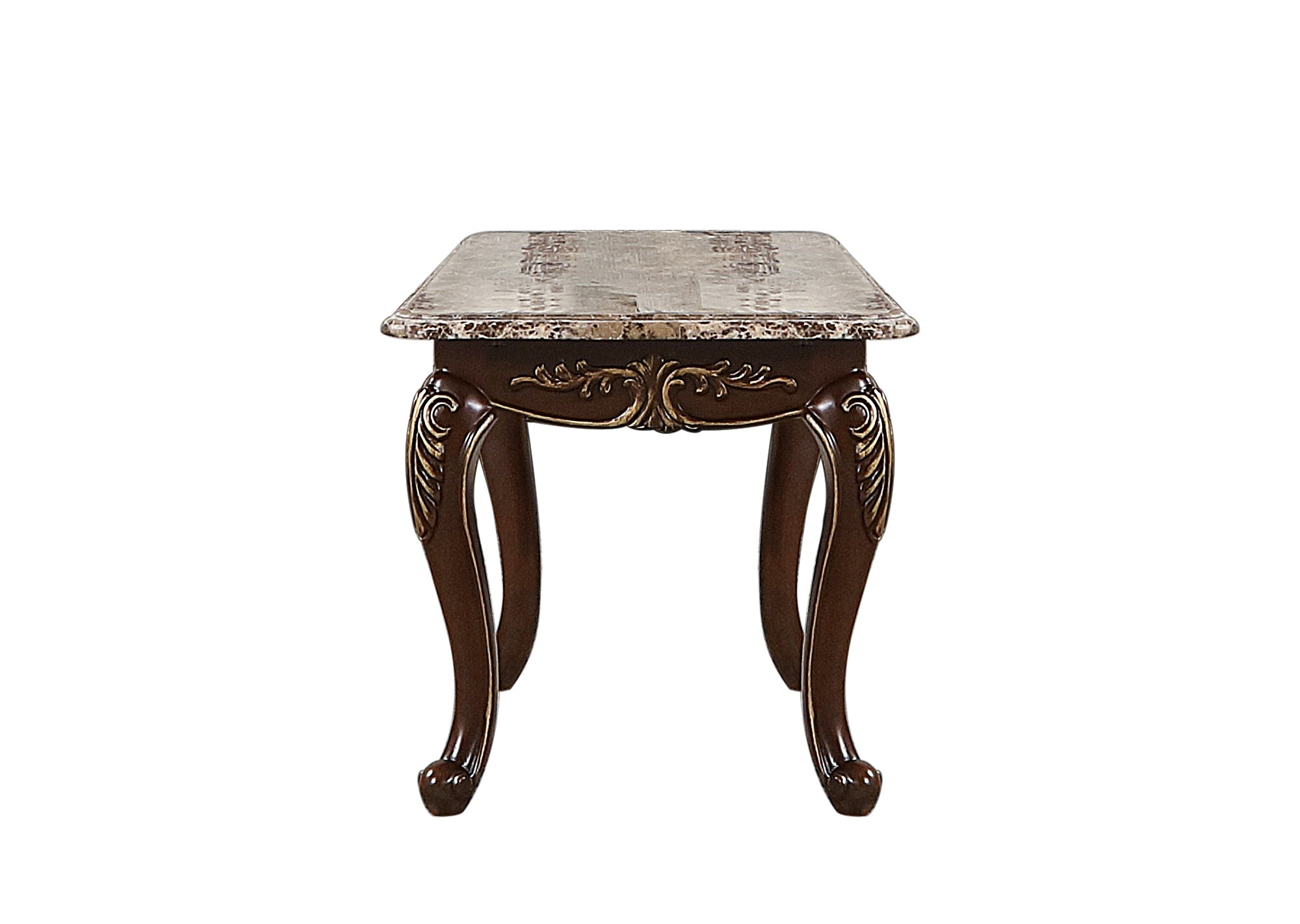- Tables: Coffee table and end tables in a warm cherry wood finish with classic proportions and durable tops that complement the upholstery.
