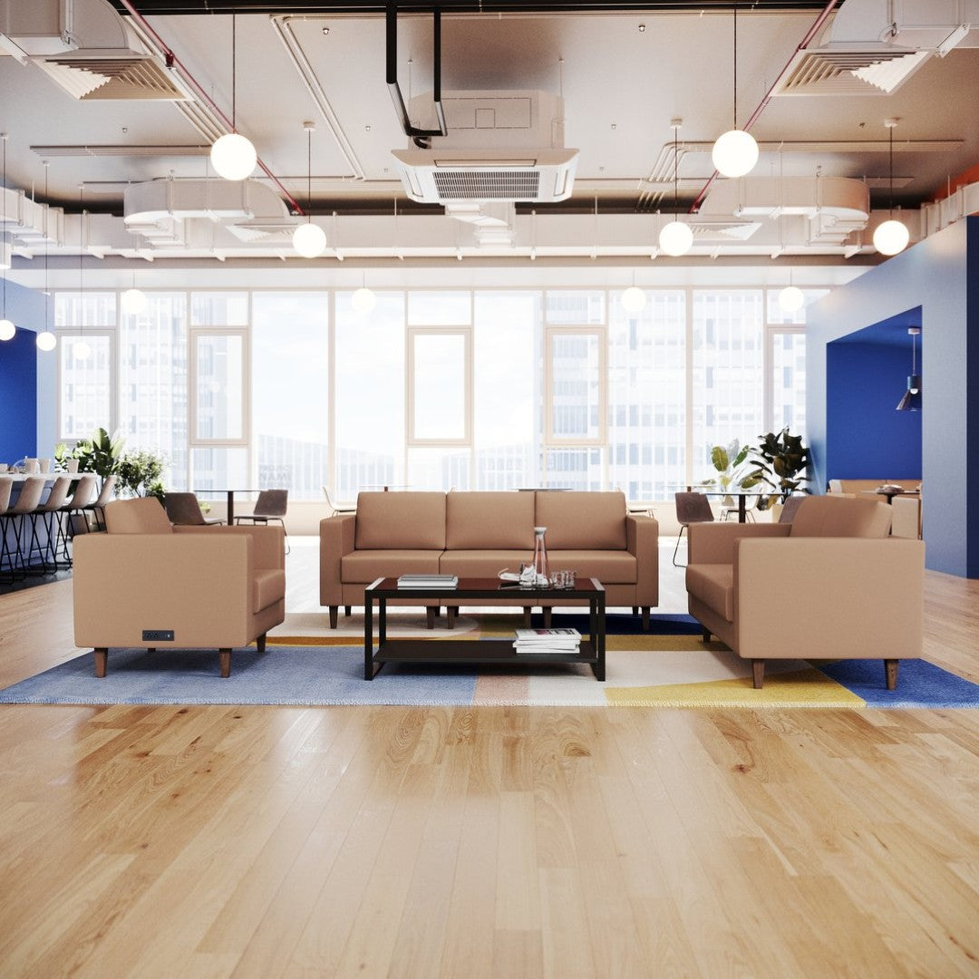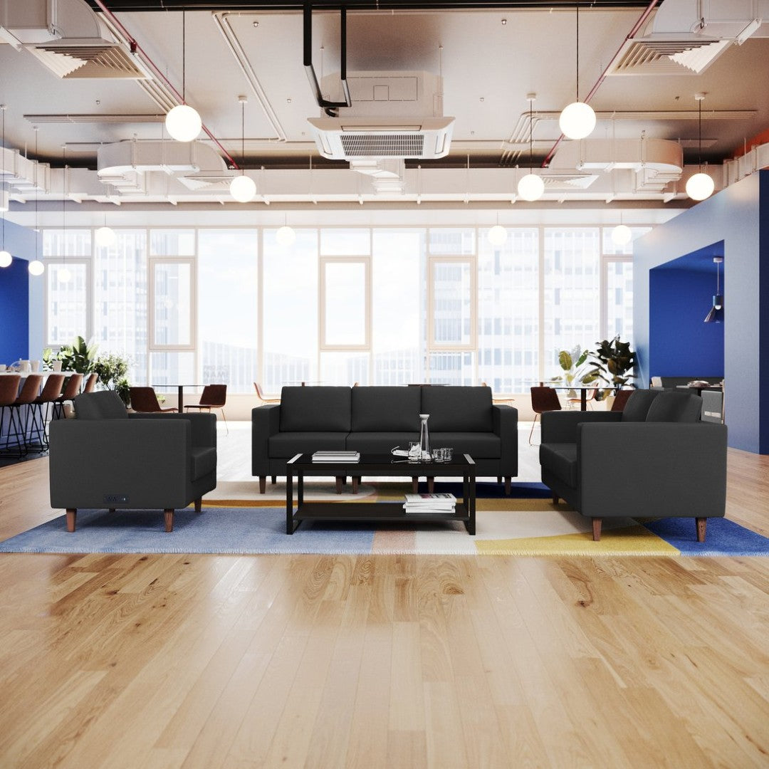 Upgrade your reception area with this professional three-piece lounge set that blends upscale styling with practical, modern amenities. Designed for commercial waiting rooms and executive lobbies, the set delivers comfortable, durable seating plus convenient integrated charging so visitors can stay connected while they wait. Its clean black LeatherSoft upholstery, plush cushioning, and solid walnut-style legs create a polished, cohesive look that’s easy to maintain and quick to assemble.