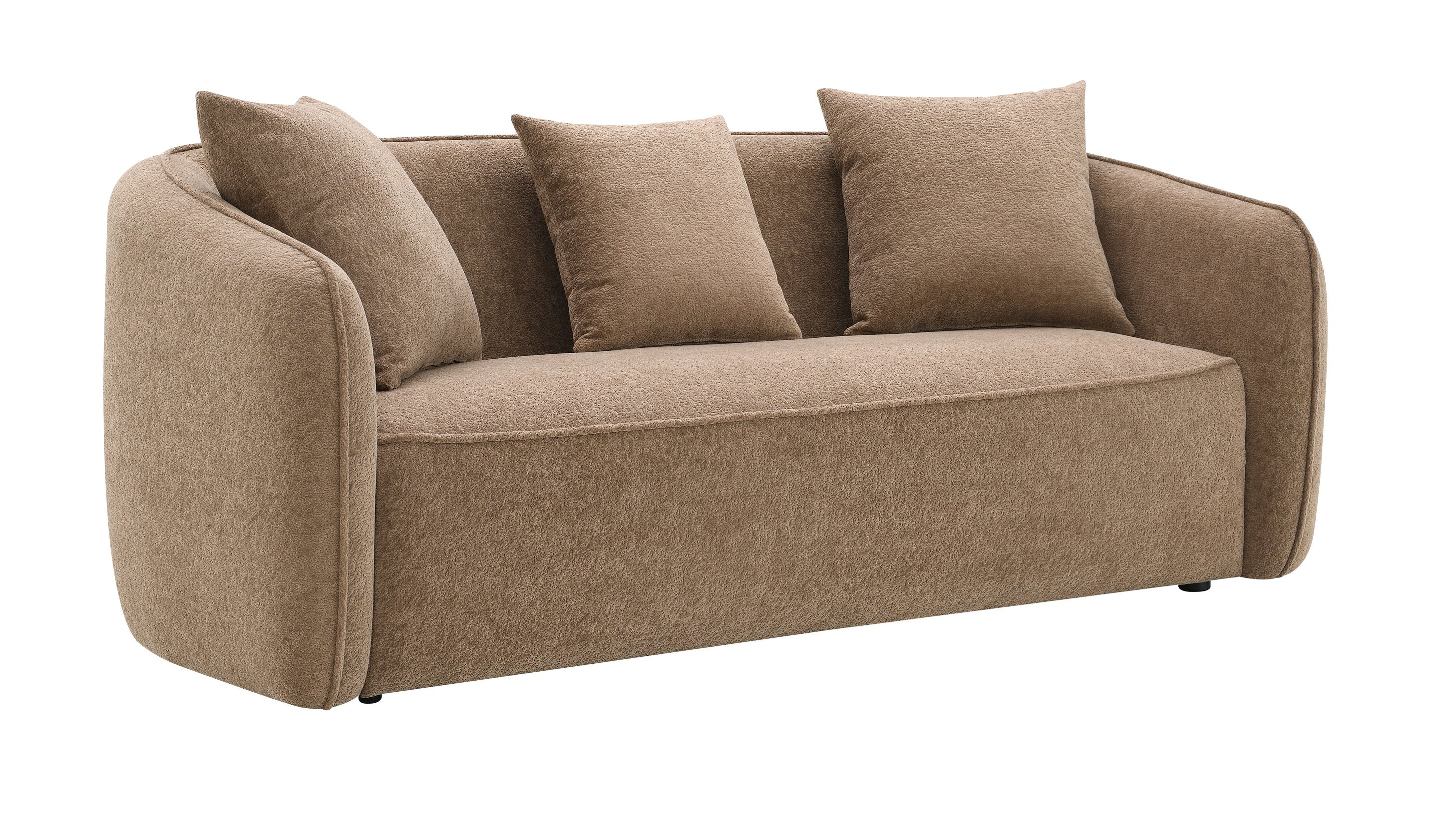 - This elegant sofa is upholstered in a soft and durable brown chenille fabric, creating a cozy yet sophisticated ambiance in any living space. Sofa comes with 3 matching color toss pillows.