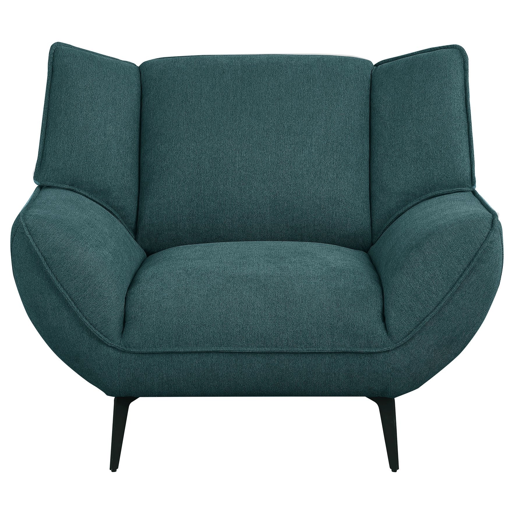 Bring a bold, modern statement to your living space with this Logan three-piece seating set in rich teal blue. Designed for both visual appeal and lasting comfort, the collection pairs a wingback silhouette and flared armrests with plush, supportive cushions and sturdy metal legs—making it an ideal centerpiece for everyday living, entertaining, or quiet relaxation.