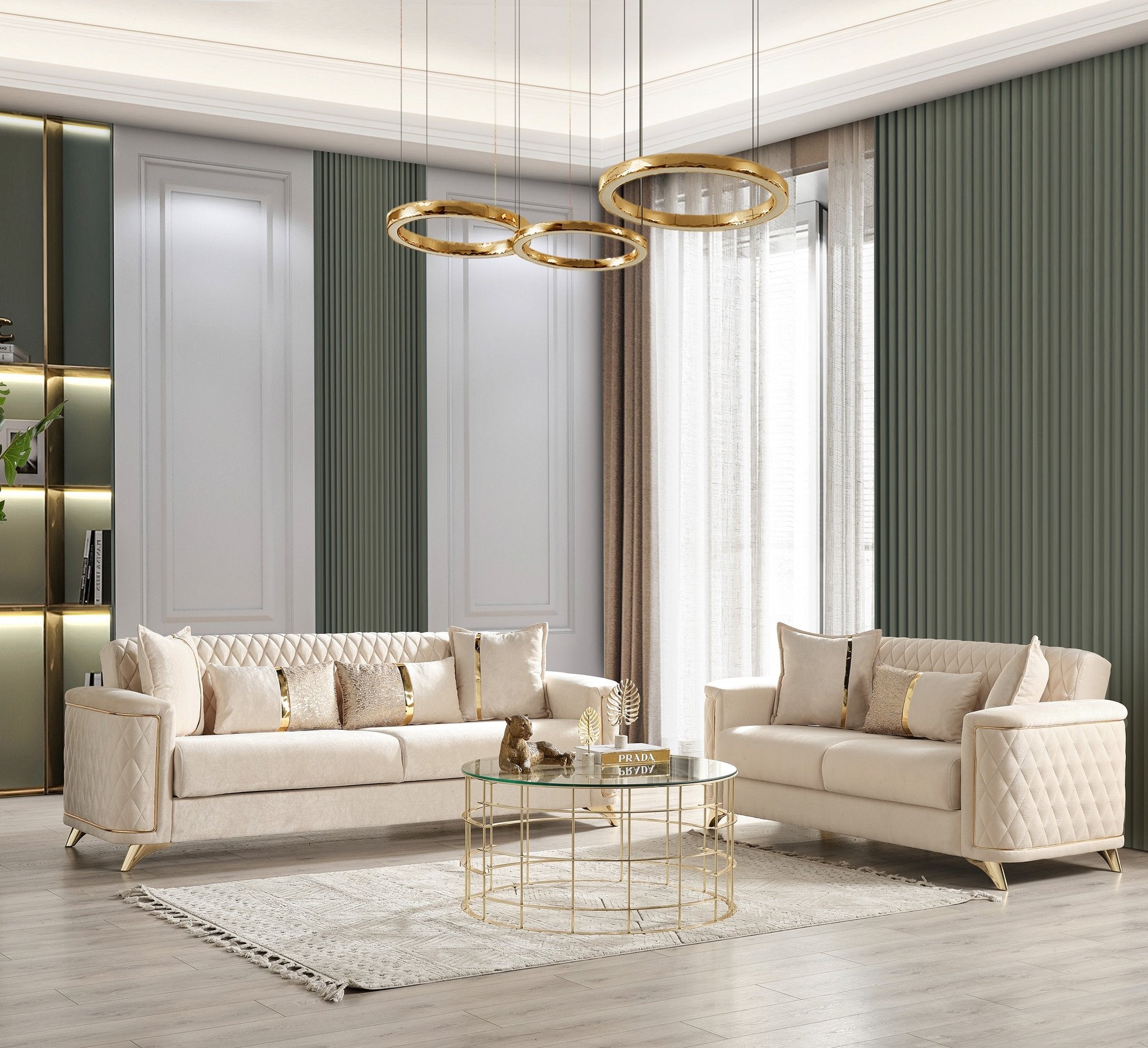 - Set Includes: 1 Sofa and 1 Loveseat in ivory velvet-like upholstery.