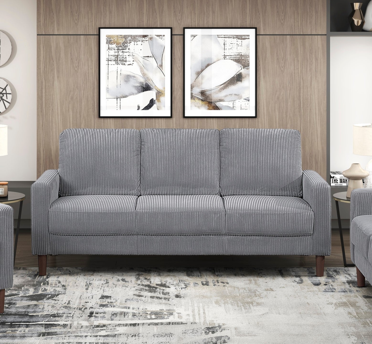 Bring modern comfort and textured style into your living space with this 3-piece contemporary sofa set. Upholstered in soft gray corduroy, each piece combines clean lines, plush cushioning, and sturdy faux wood-finish legs to create an inviting, versatile seating group ideal for living rooms, apartments, or family spaces. Designed for everyday relaxation and effortless coordination with a variety of decor, the set offers a side chair for compact areas plus a loveseat and full sofa for generous seating.