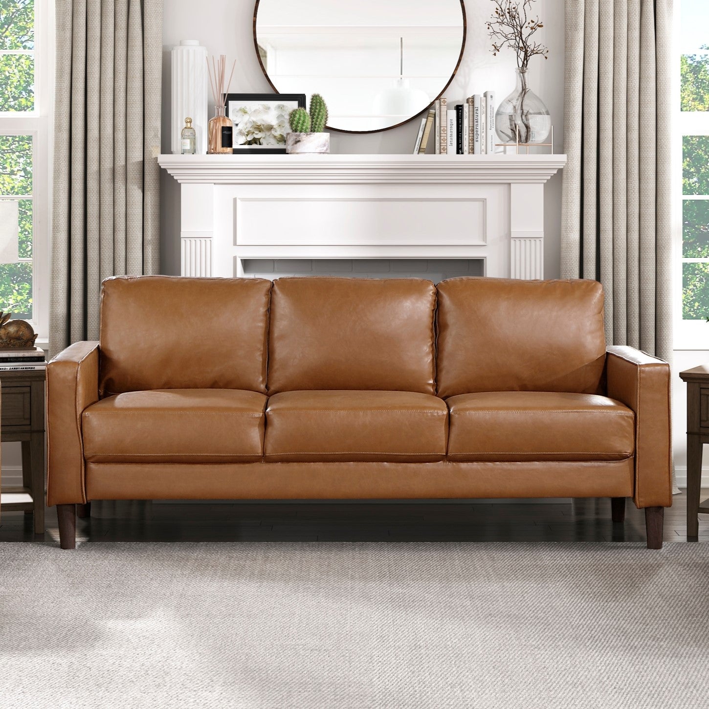 - Materials: Brown faux leather upholstery, upholstered cushion backs, solid wood frame