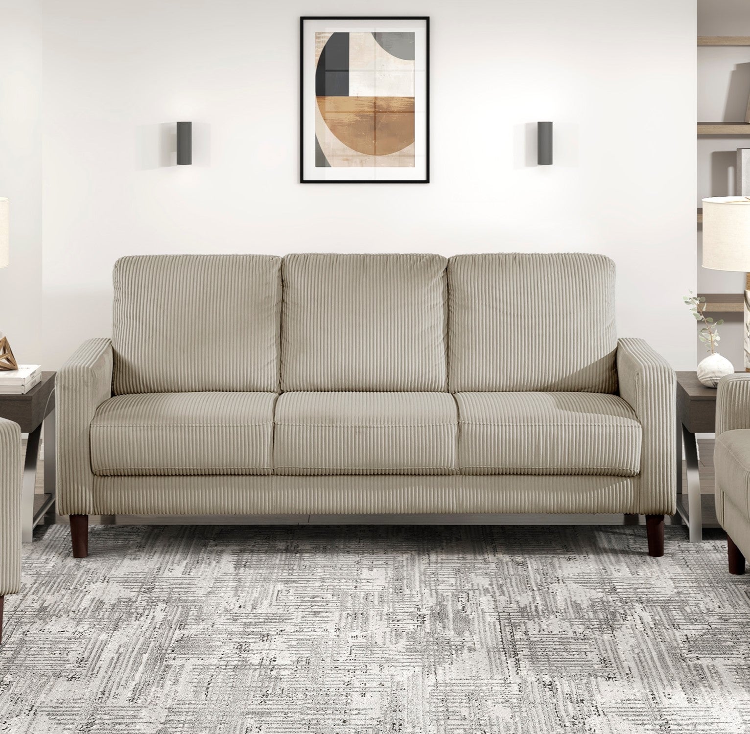 Transform your living space with this modern contemporary 3-piece seating set, combining plush comfort and refined style. Upholstered in soft taupe corduroy with a clean silhouette and sturdy faux-wood legs, the sofa, loveseat, and chair deliver an inviting look and exceptional comfort for everyday lounging or hosting guests. Ideal for apartments, family rooms, or updated living rooms, this set balances cozy cushioning with streamlined design for versatile décor coordination.