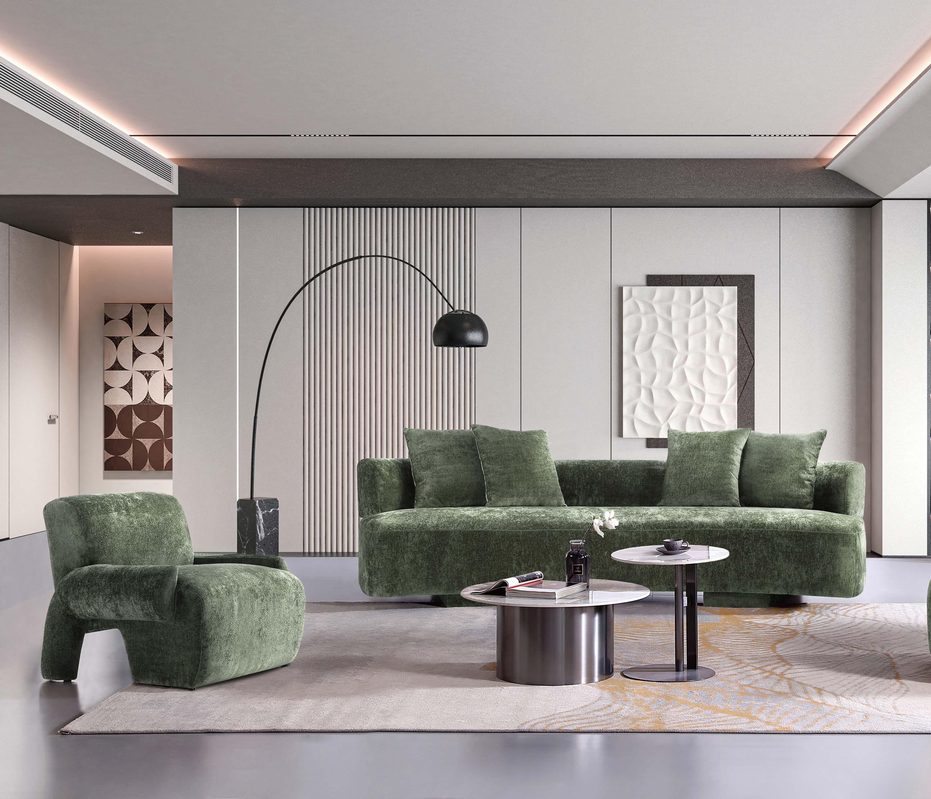 Step into luxury with the Verandah Collection, where every piece is a masterpiece of comfort and style. Upholstered in sumptuous chenille and boasting a distinctive rounded rectangular silhouette, each sofa, Sofa, and accent chair stands out as a testament to timeless elegance. Whether as striking standalone pieces or harmoniously arranged together, this collection elevates any living space with its blend of sophistication and inviting charm.- Mid-Century Modern Sofa and Accent Chair Perfect for Living Room Use. Set of 2.