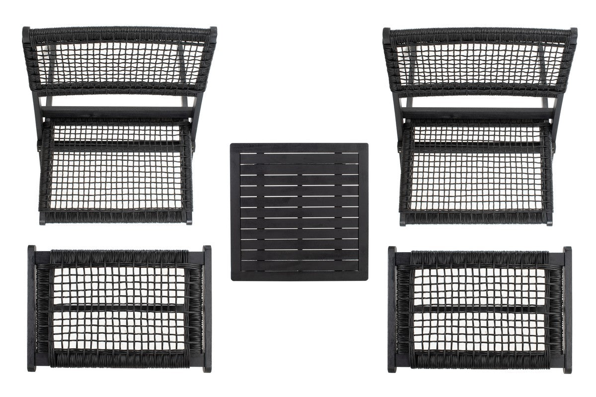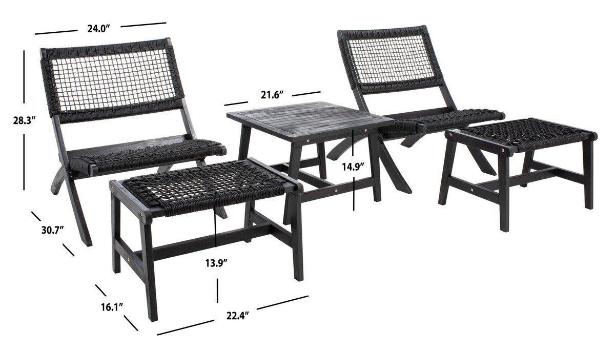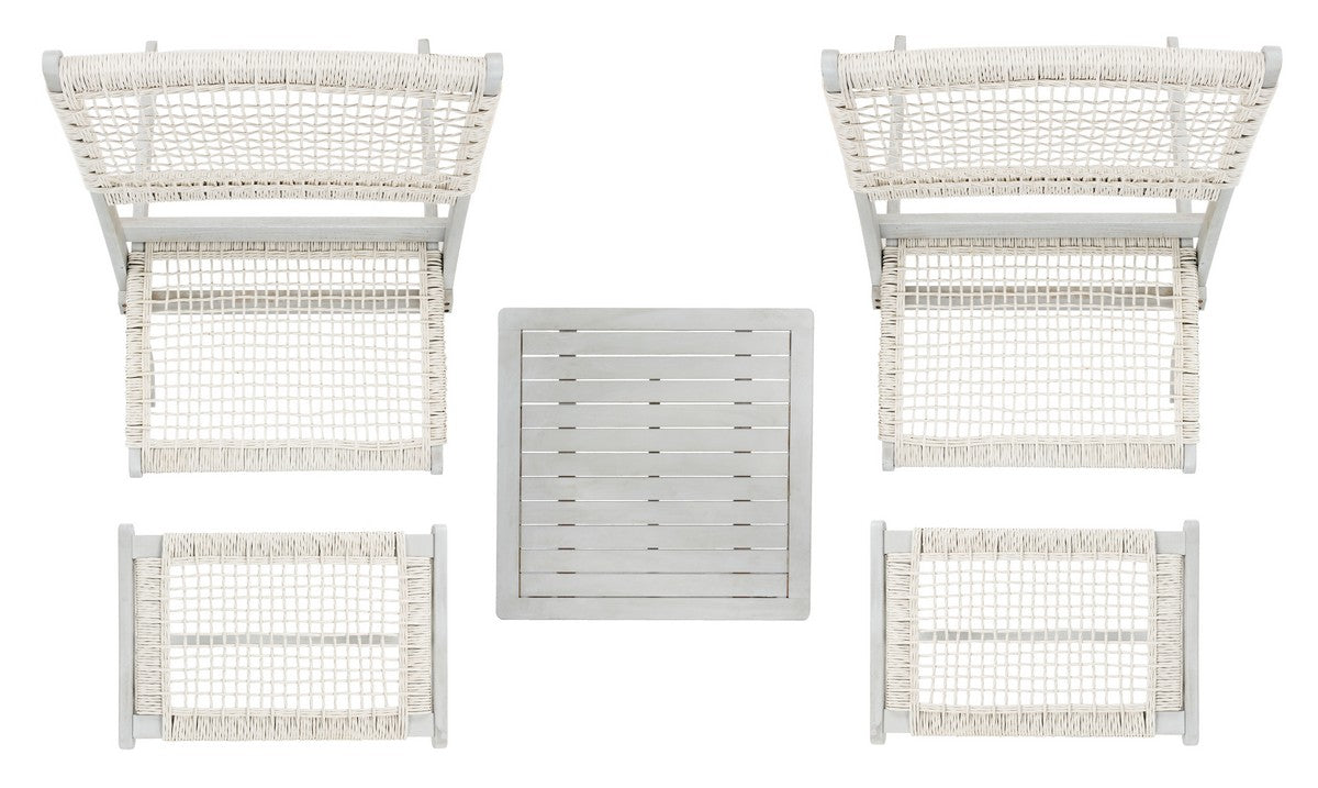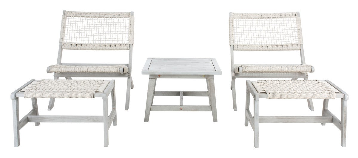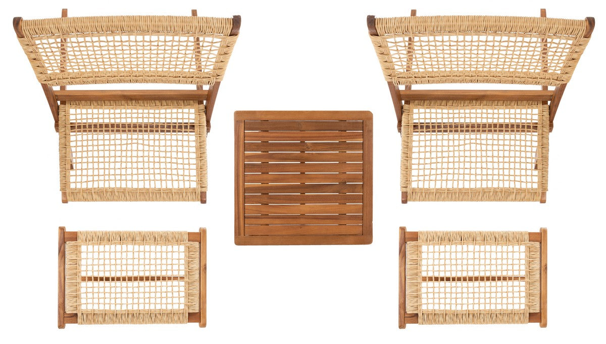 This Casella Set allows you to stretch out and enjoy the summer breeze with ease and style. Two natural finished acacia wood chairs and matching ottomans allow for lavish lounging in the sunshine, and an end table provides ample space for coffees, cocktails, or snacks.