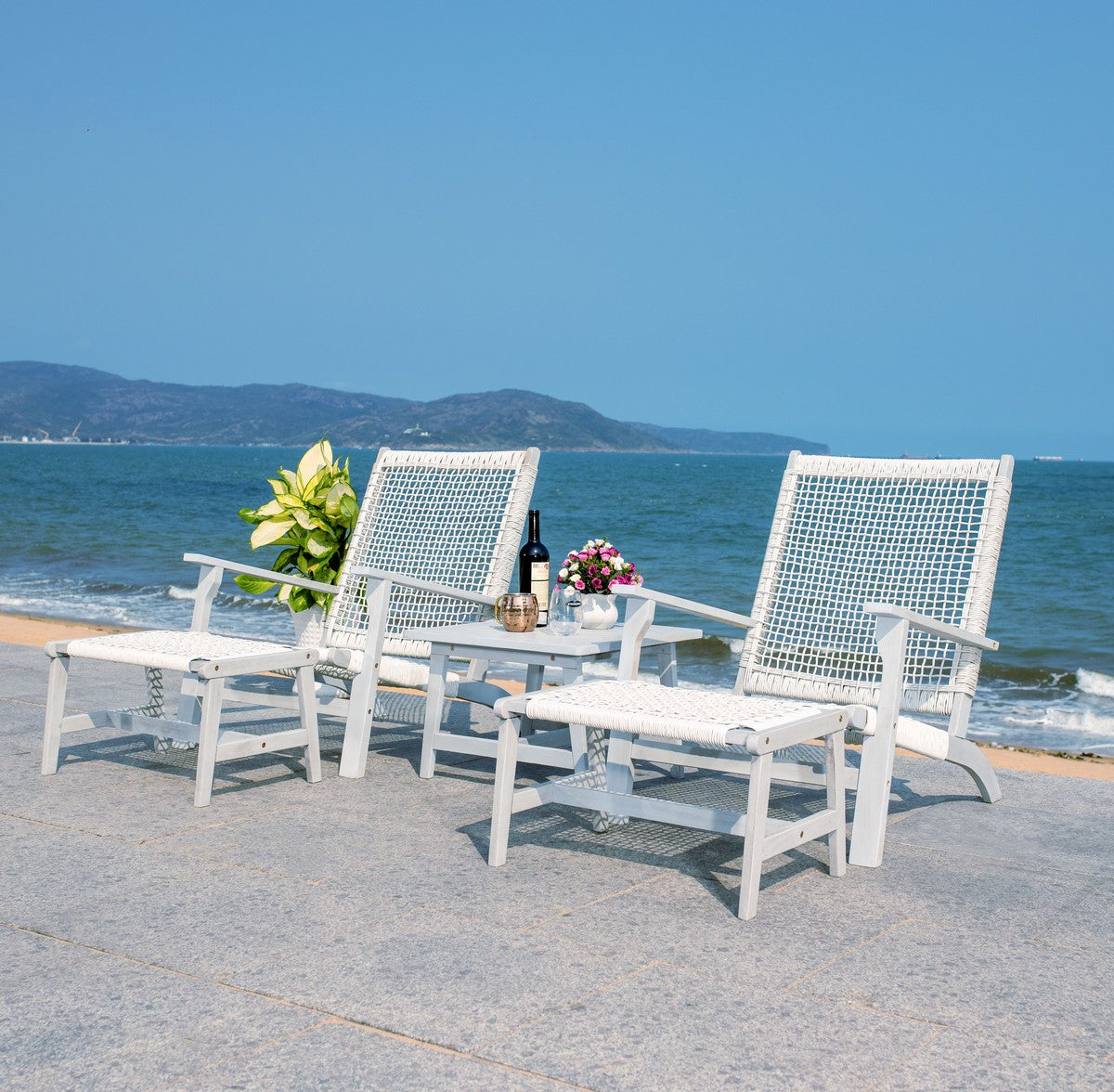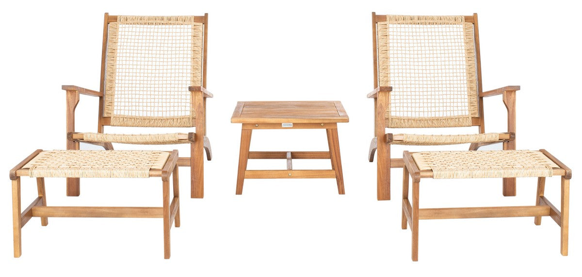 Bring the tropical resort to your own backyard with this coastal Chantelle Set. Chantelle’s two low natural acacia seats and matching stools allow you to stretch out and lounge in luxury, and its end table is perfect for aperitifs or appetizers. Designers love Chantelle’s light brown woven rattan.