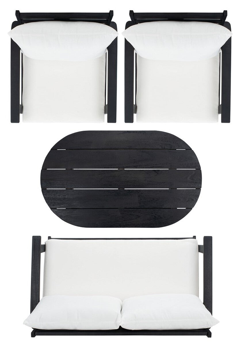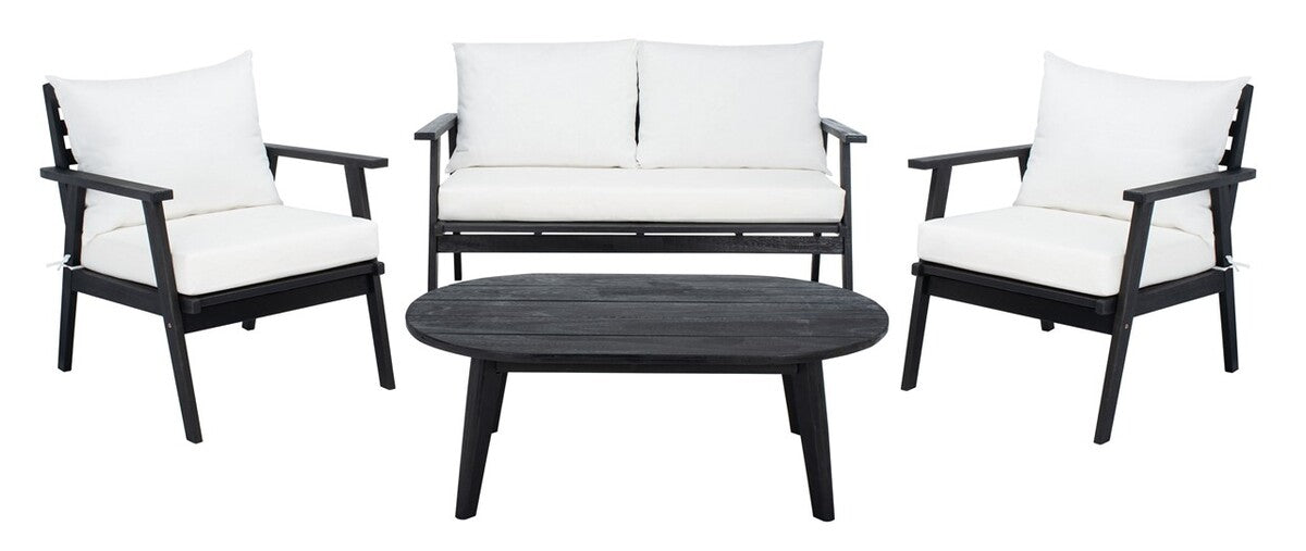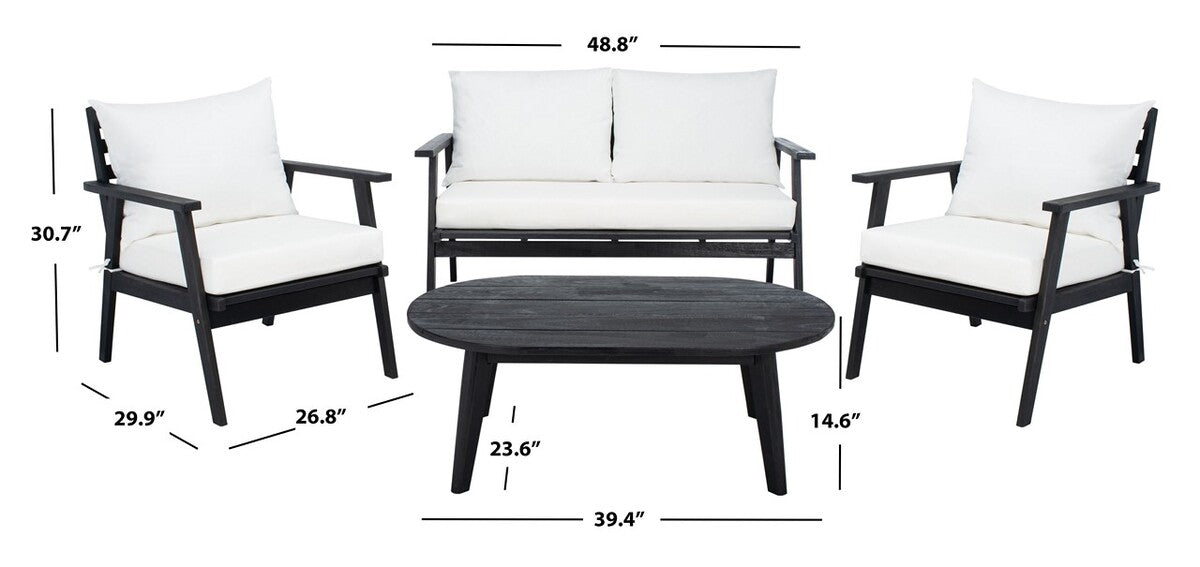 Designed for value and versatility, this contemporary 4-piece living set creates an instant outdoor room in any open-air space. Comfy beige pillows sit on expertly crafted black wood frames, while its matching circular table is ideal for entertaining.