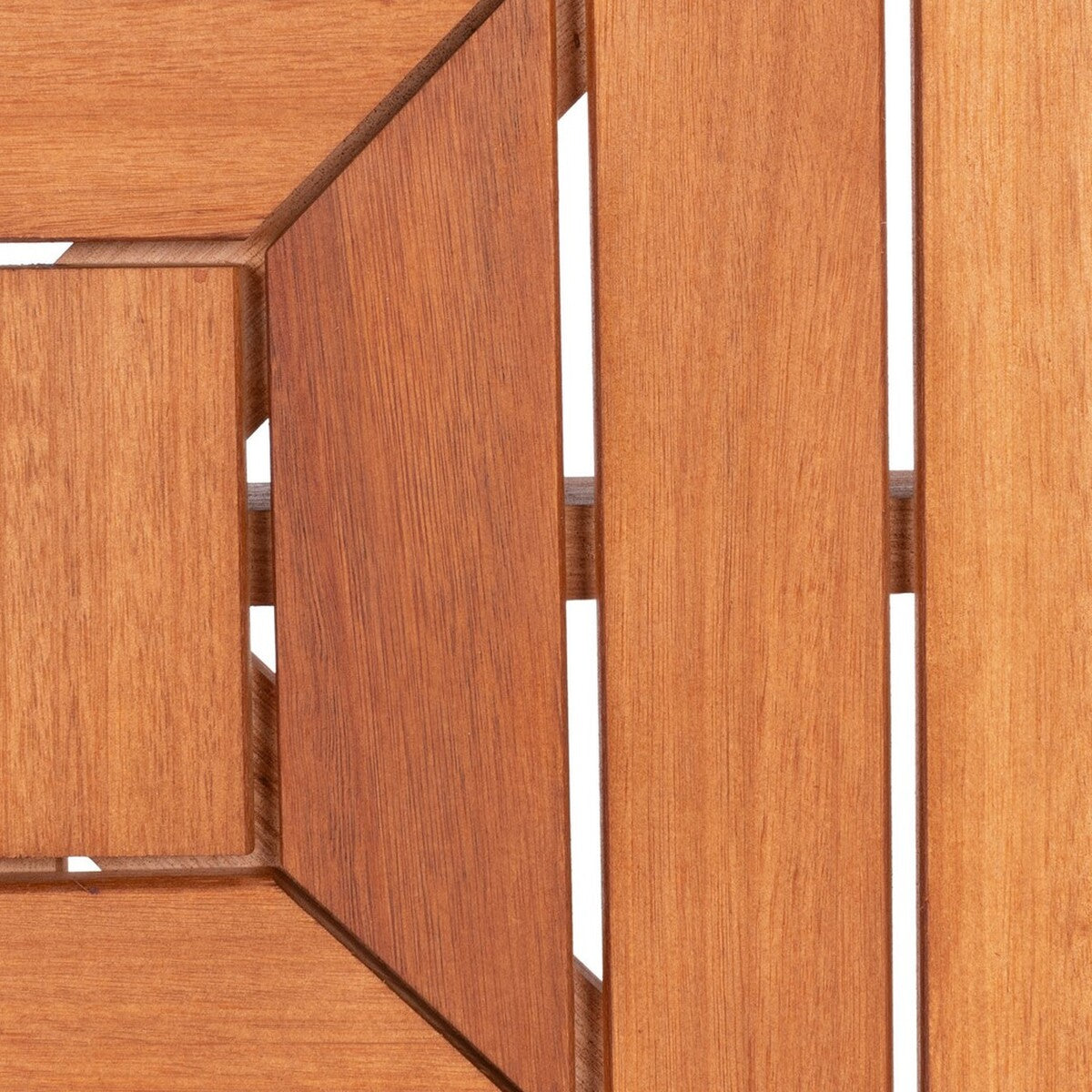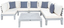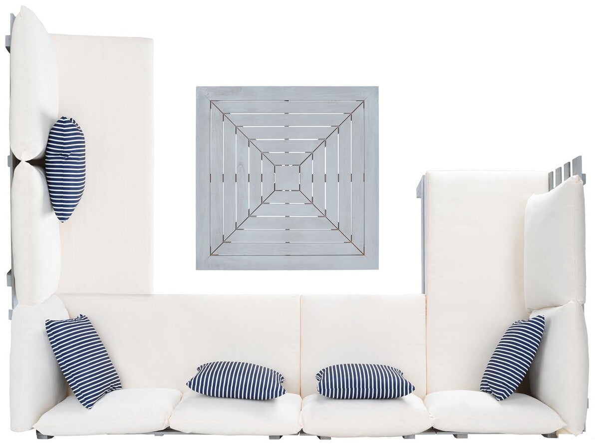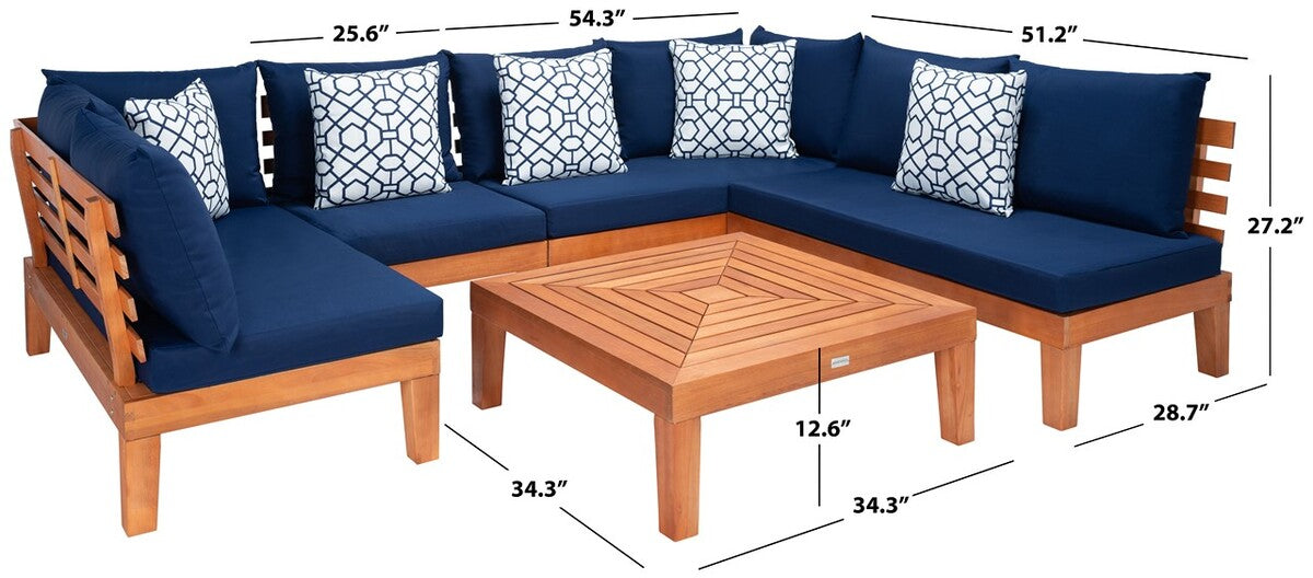Create a backyard oasis with this stylish outdoor living set. Made using Eucalyptus wood and includes a sectional sofa in beige upholstery and throw pillows. A matching coffee table is ideal for entertaining.