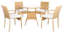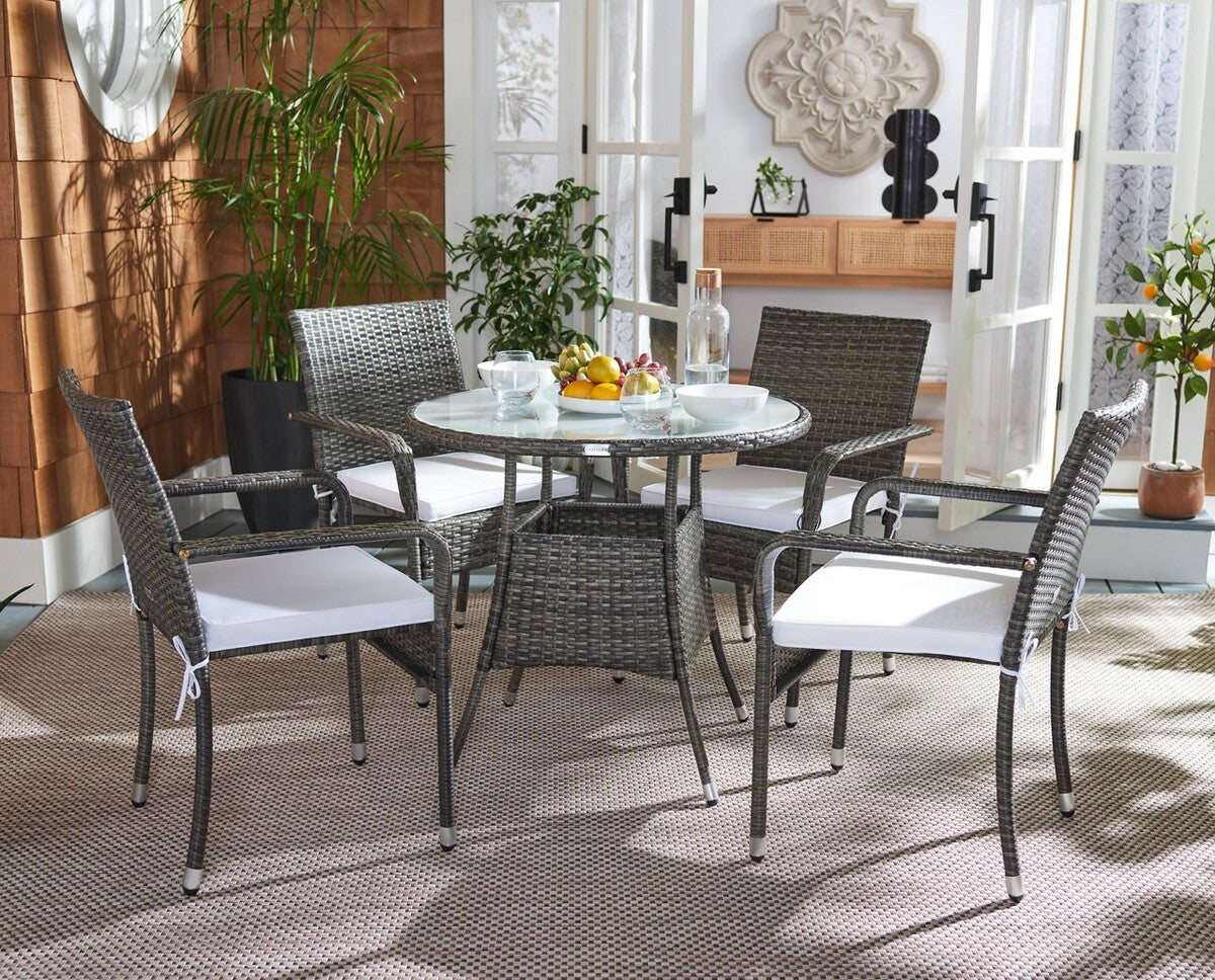 A modern take on French al fresco dining, al fresco dining, this Laina Bistro Set emanates class and charisma on any porch or patio. Natural wicker details update Laina’s classically styled table and chairs, and soft white cushions make for comfortable, restaurant quality dining.