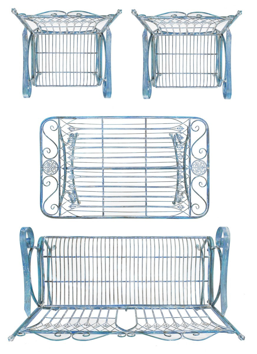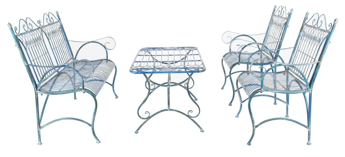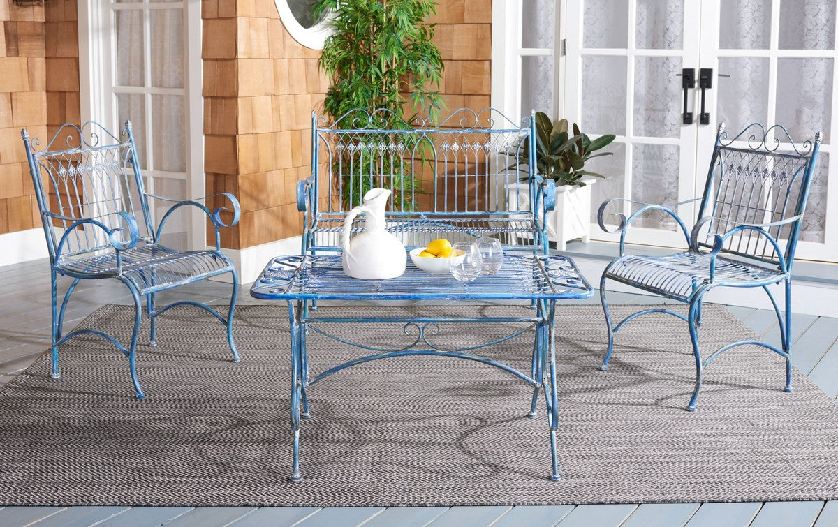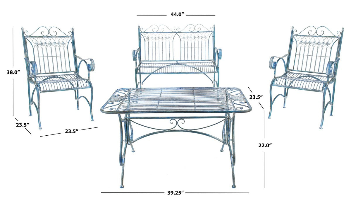 Emanating turn of the century charm, this Leah Four Piece Set gives any outdoor area a classic, romantic ambiance. Crafted of intricately worked iron in an antique blue finish, Leah’s Victorian inspired scroll details transform your patio into an elegant entertainment space. Includes a loveseat, two chairs, and coffee table.