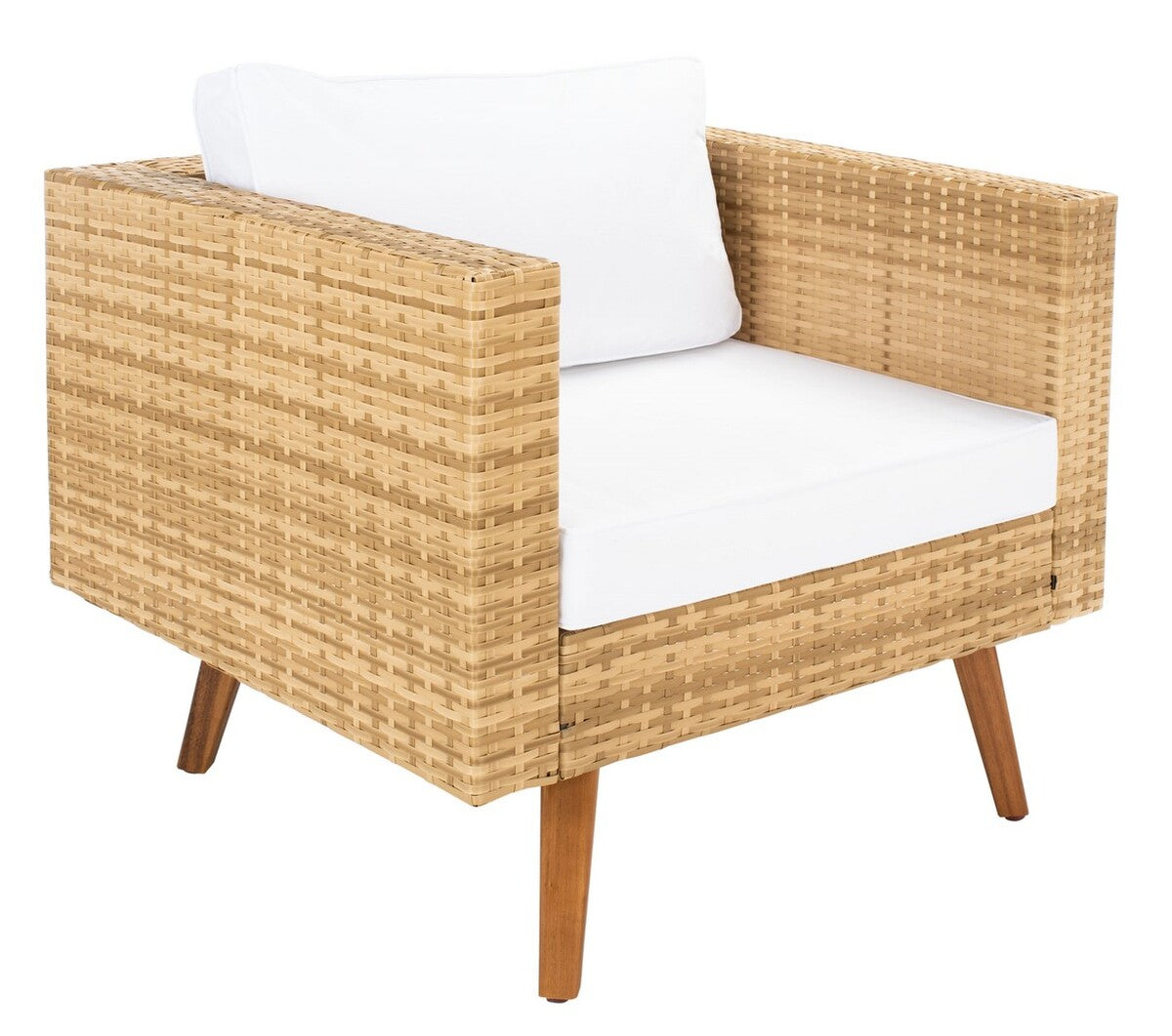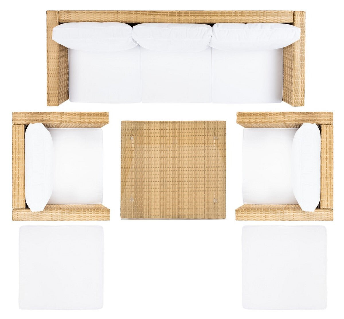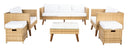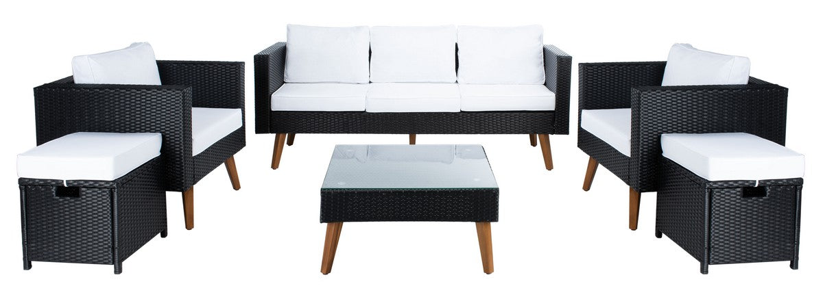 Retro minimalism goes modern coastal in this Presla 6 Piece Living Set. Including two cushioned ottomans, two armchairs, one three seater sofa, and a glass topped coffee table, Presla’s black wicker frames are perfectly paired with Mid Century acacia legs, making for stylish, luxurious outdoor décor.