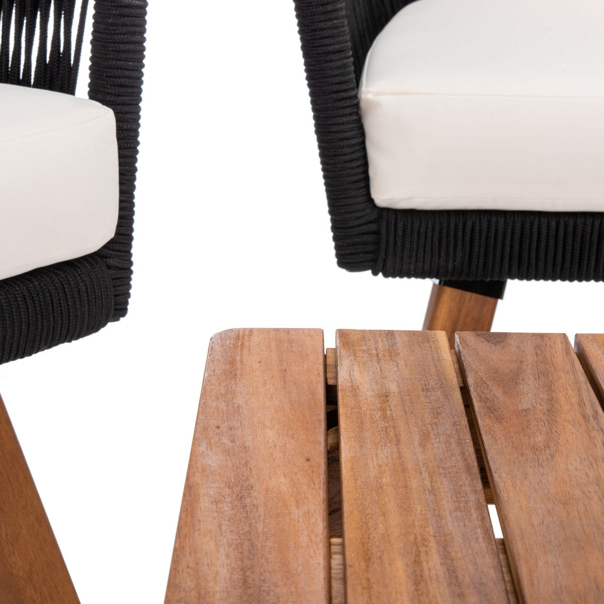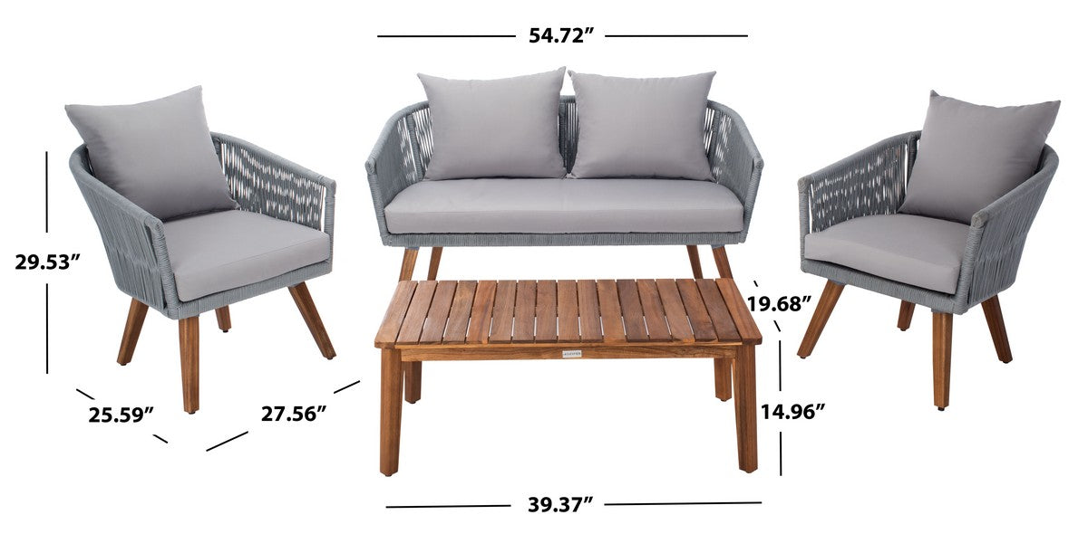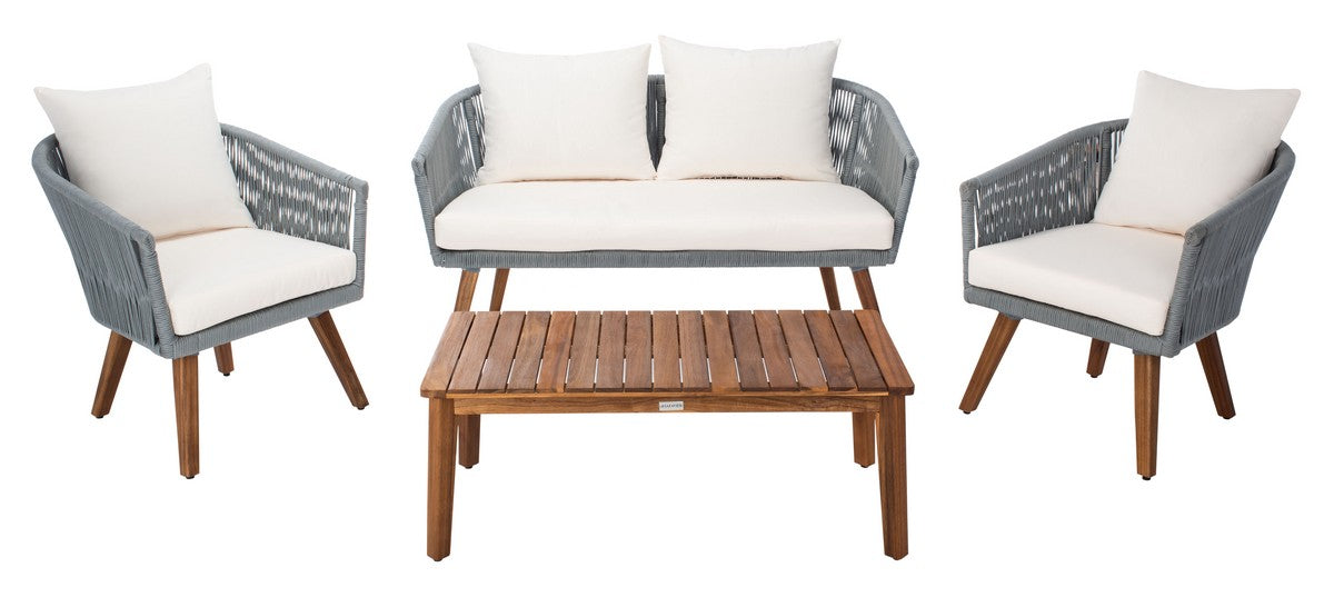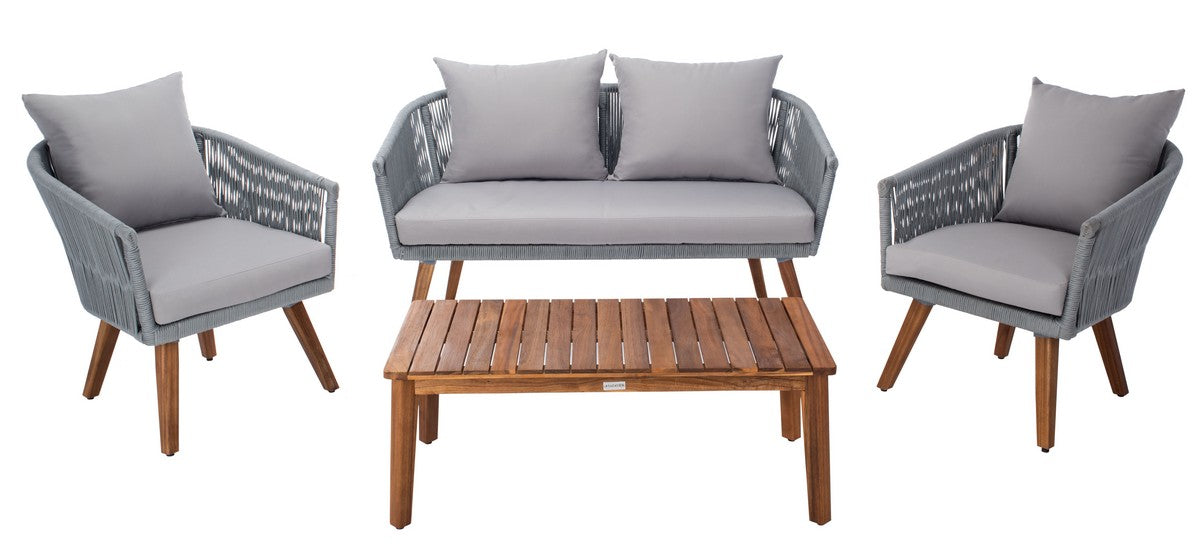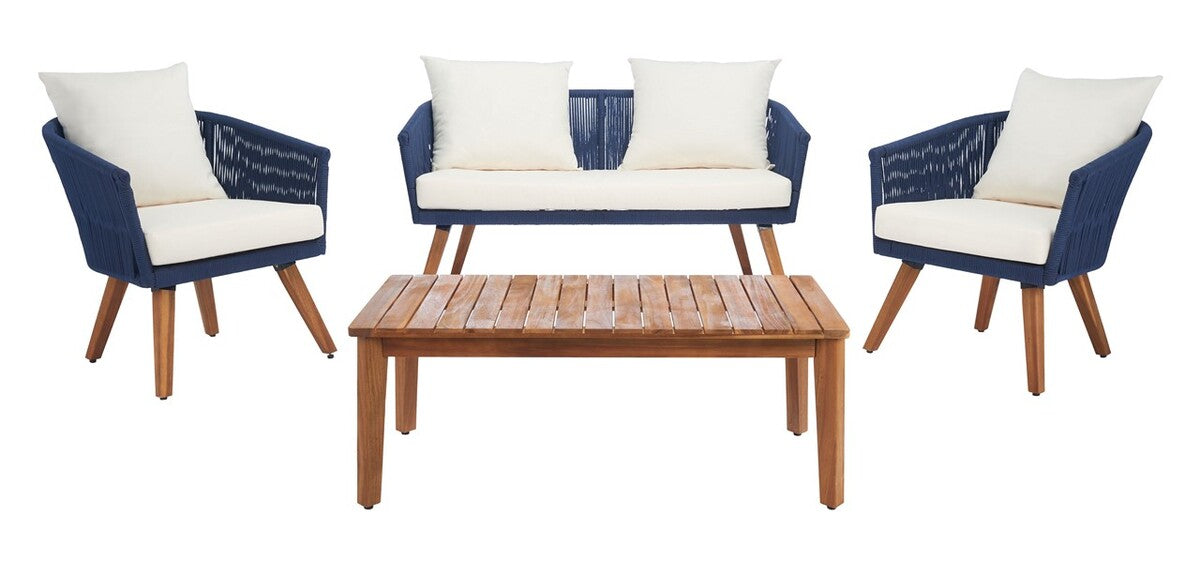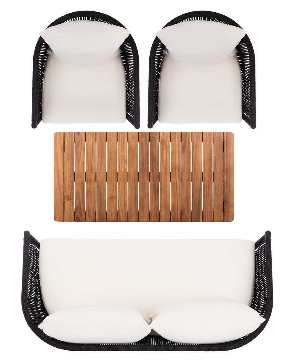 Create the ultimate stay-cation with this Velso 4-Piece Living Set. Designed to bring luxe boho style to any outdoor space, the modern curves and lines on its lush settee, armchairs, and table are crafted with natural-finished acacia and navy rope. Beige cushions add endless comfort.