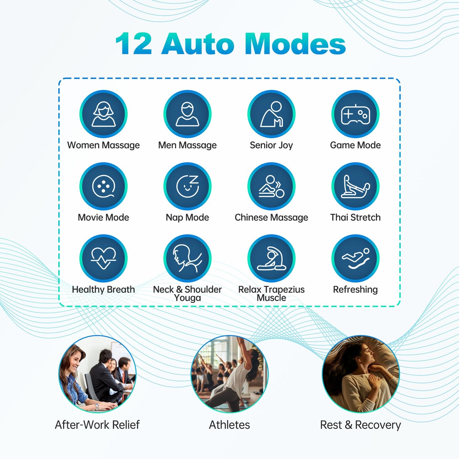 - Targeted massage tech: 18 bionic massage nodes plus 3D lumbar massage heads for focused lower-back relief and adaptable shoulder/neck adjustment to match user height.