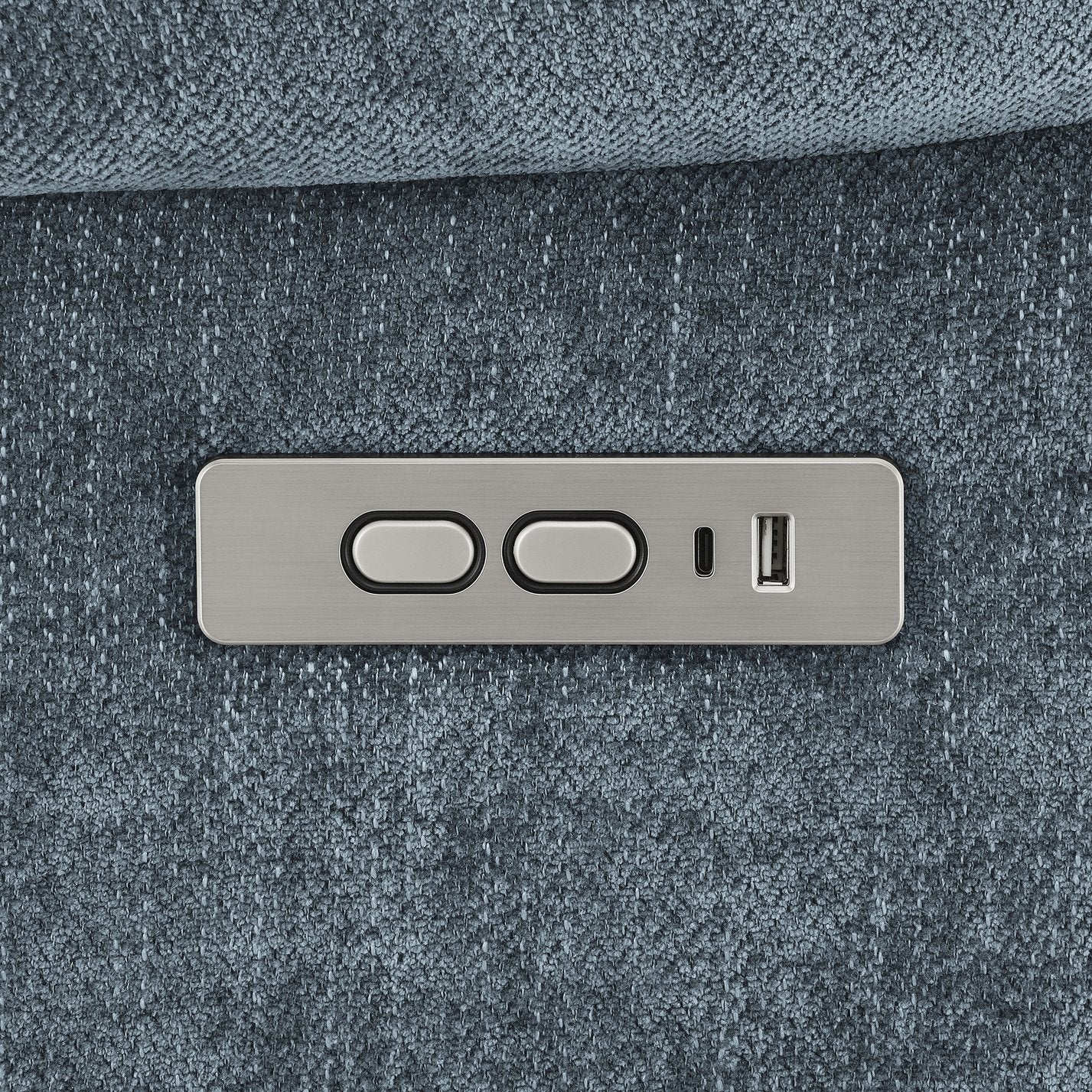 - Upholstery: Soft slate blue fabric with a black finish trim for a contemporary look