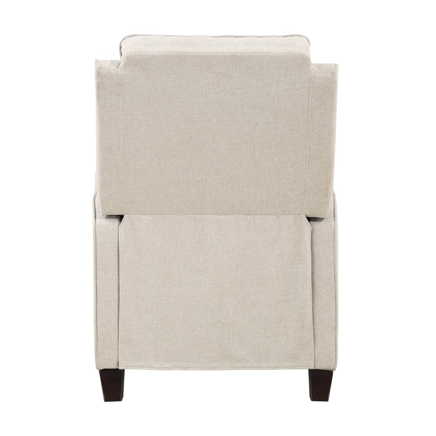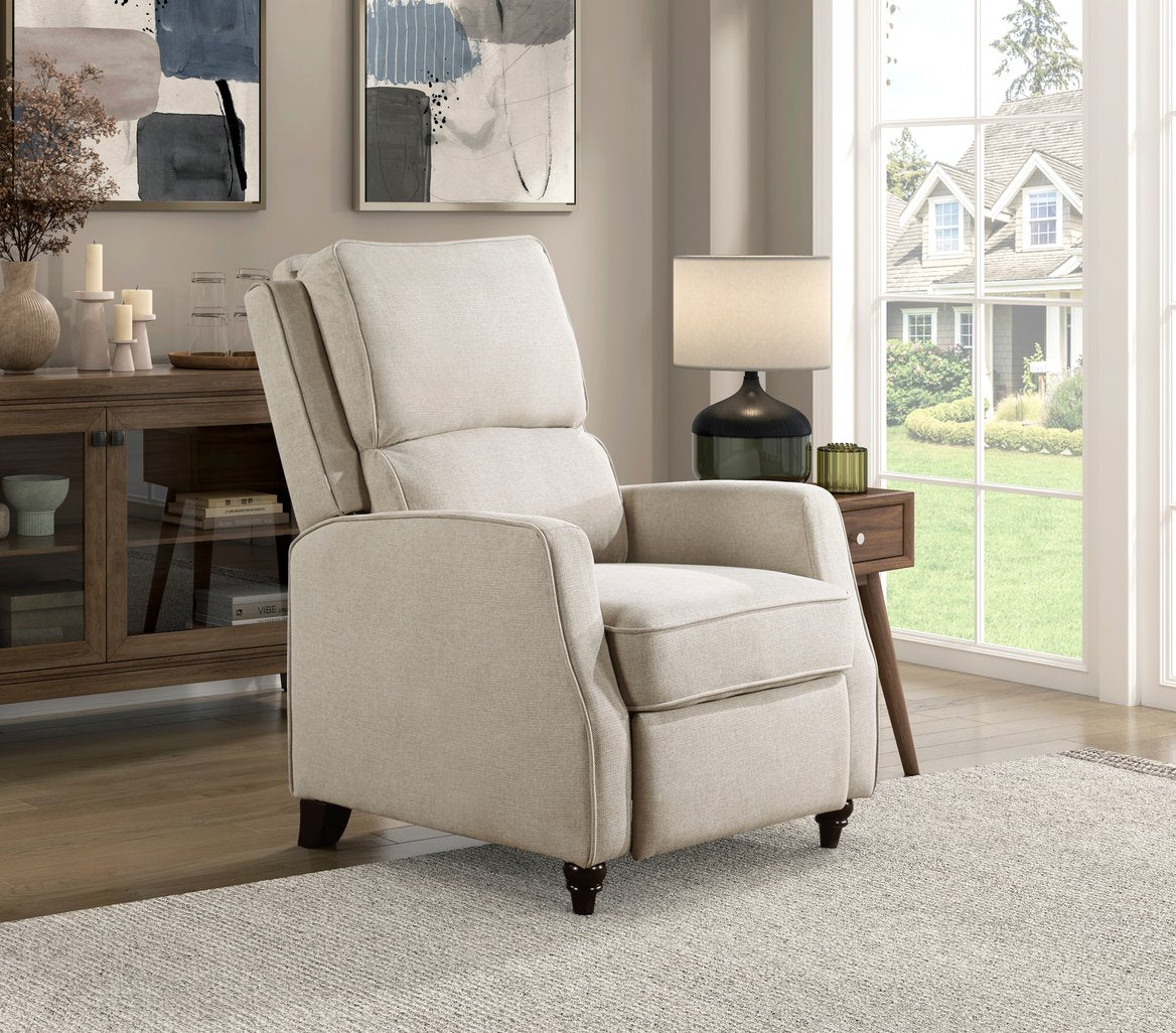 Sink into understated comfort with this beige fabric push-back recliner from the Loveland Collection—designed to blend transitional style with everyday functionality. Its textured upholstery and turned dark-brown wood legs deliver a polished, neutral look while the push-back reclining mechanism lets you effortlessly find the perfect relaxed position. Ideal for living rooms, dens, or reading nooks, this chair balances supportive seating with a compact footprint.