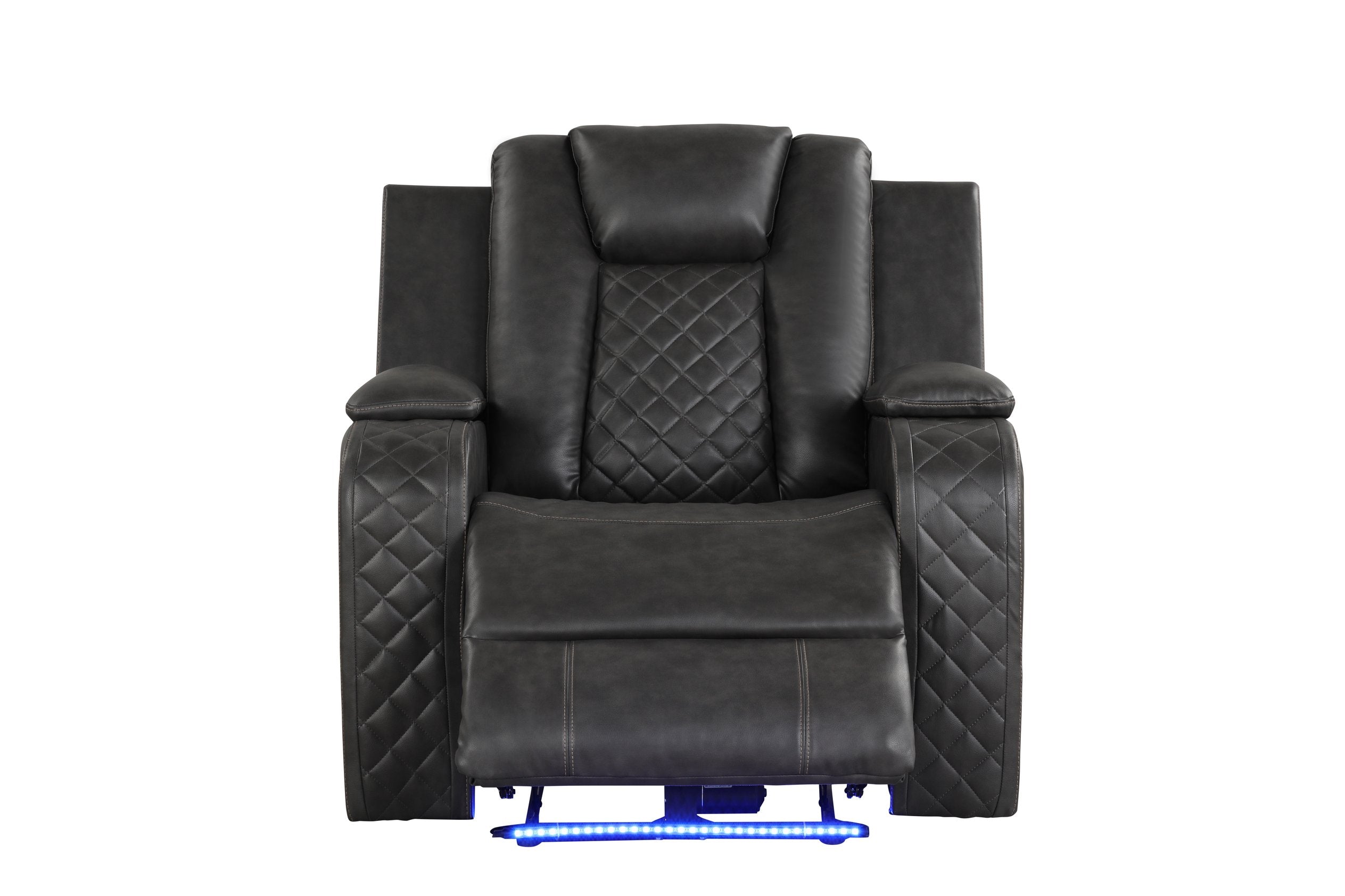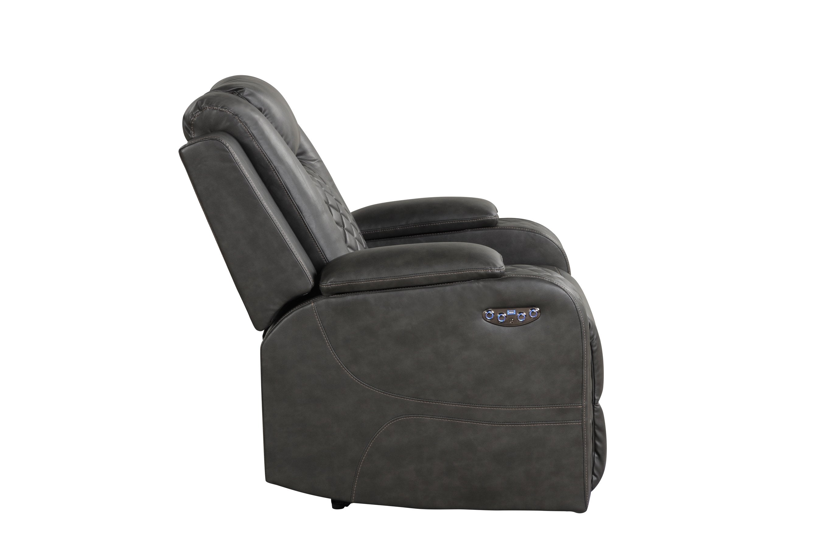 Discover contemporary relaxation perfected with the Benz Power Recliner — a stylish, feature-rich chair that blends automotive-inspired design with modern convenience. Upholstered in durable gray faux leather with a refined pebbled texture, this power recliner delivers customizable comfort via one-touch controls, premium extras like an integrated Bluetooth speaker and LED ambient lighting, and a built-in console for easy access to essentials. Ideal for living rooms, media rooms, or home theaters, it elevates both comfort and style.