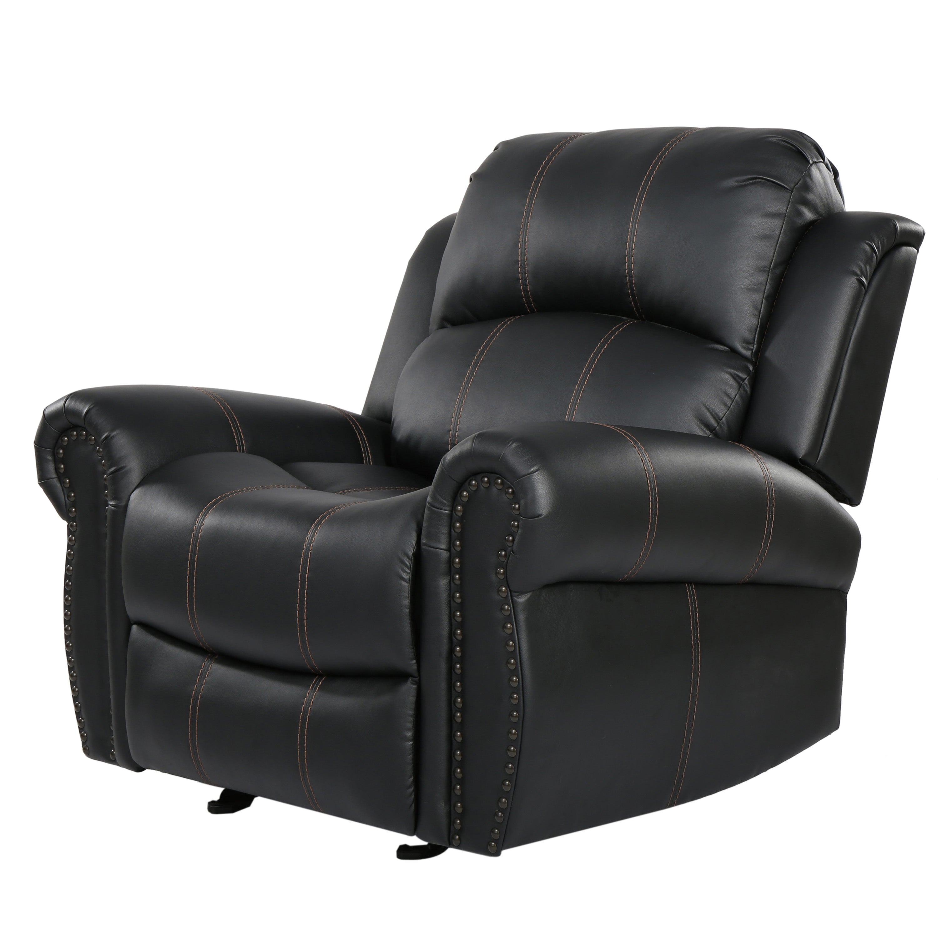 Sink into effortless comfort with this gliding recliner — a sleek, contemporary piece designed for media rooms or living spaces where style and relaxation matter. Upholstered in durable black PU faux leather and finished with refined details like vertical stitching and nailhead trim, it offers supportive foam padding and a smooth manual recline-and-glide action for two comfortable positions.