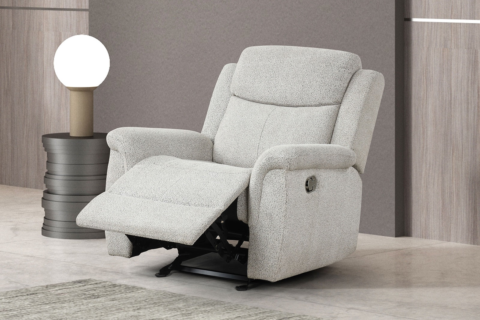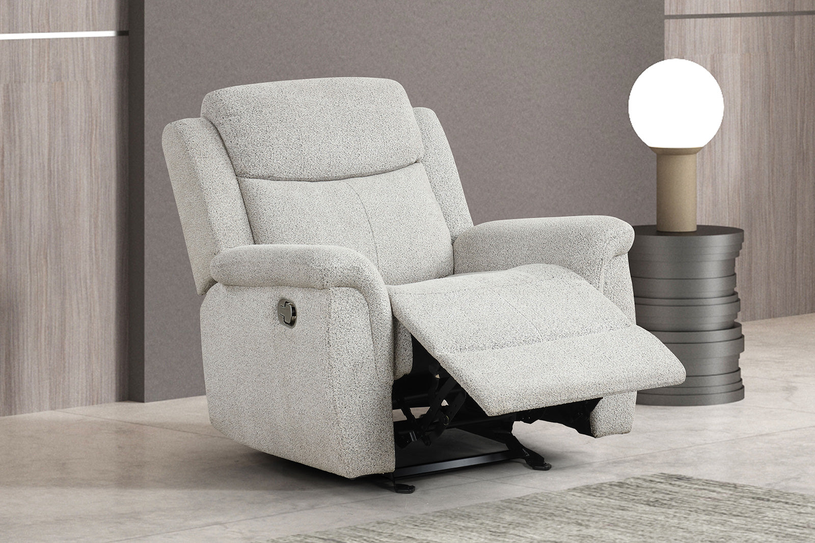 Sink into everyday comfort with the Sandbach manual glider recliner — a contemporary, compact chair designed for living rooms where style and relaxation matter equally. Upholstered in a versatile light gray fabric and fitted with padded track arms, this glider recliner combines smooth reclining motion with a gentle gliding action for added comfort during reading, TV time, or quiet lounging.