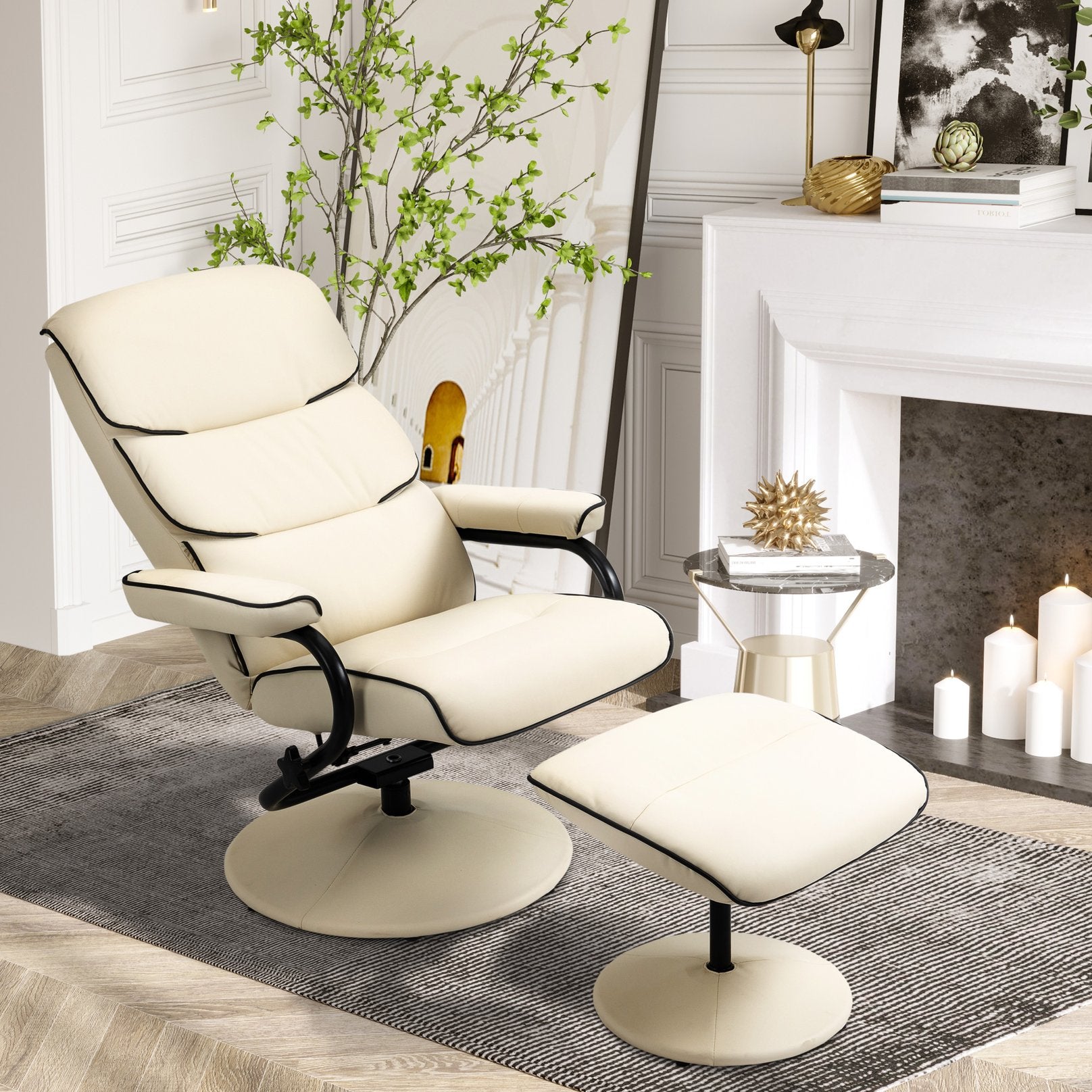 Sink into comfort with this two-piece recliner and ottoman set, thoughtfully designed for everyday relaxation. Wrapped in soft cream PU leather and filled with thick foam padding, the high-back chair provides supportive cushioning while the matching ottoman elevates your legs for improved circulation and leisure. Smooth 360° swivel movement and a push-button recline up to 135° let you find the perfect position for reading, watching TV, or unwinding after a long day.