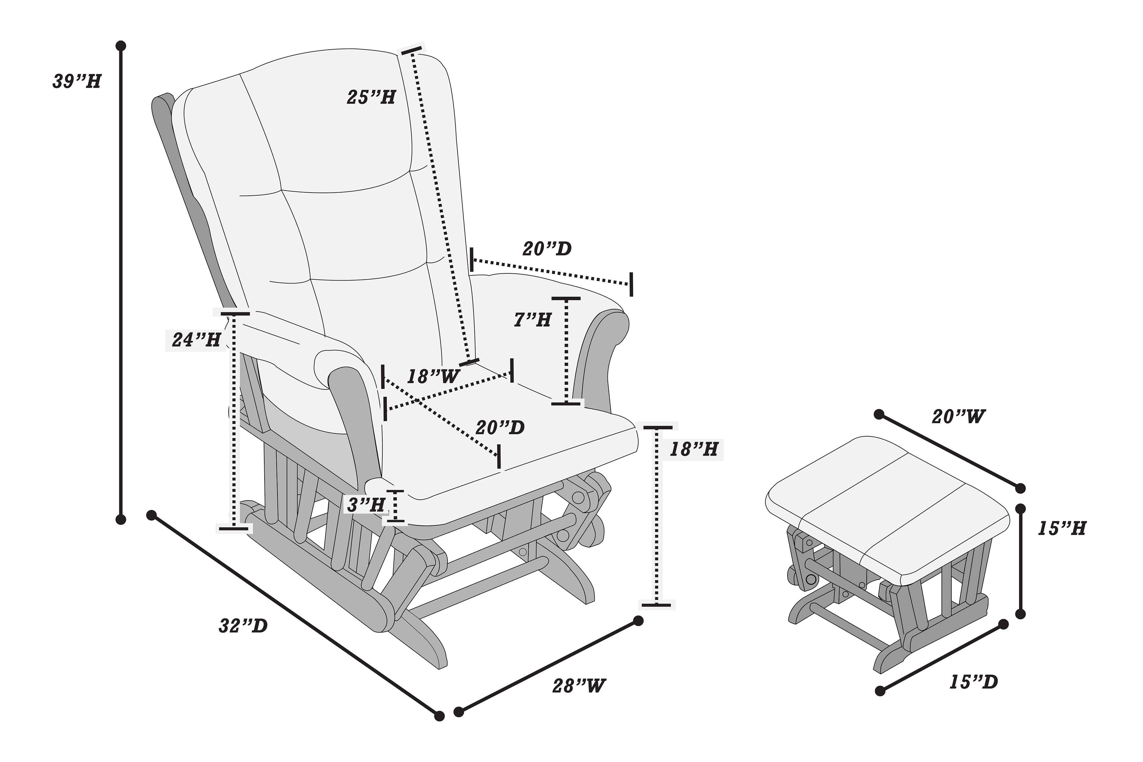 - Product dimensions (prominent): Glider: 28" L x 32" W x 39" H; Ottoman: 20" L x 15" W x 15" H. (Note: listing also references alternate product dimensions 36" L x 23" W x 21" H—please verify model before purchase.)