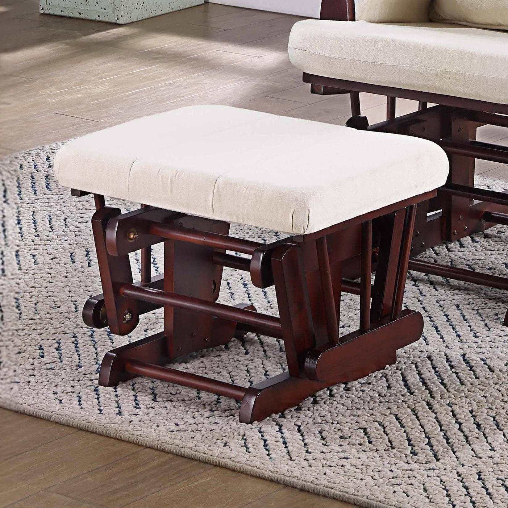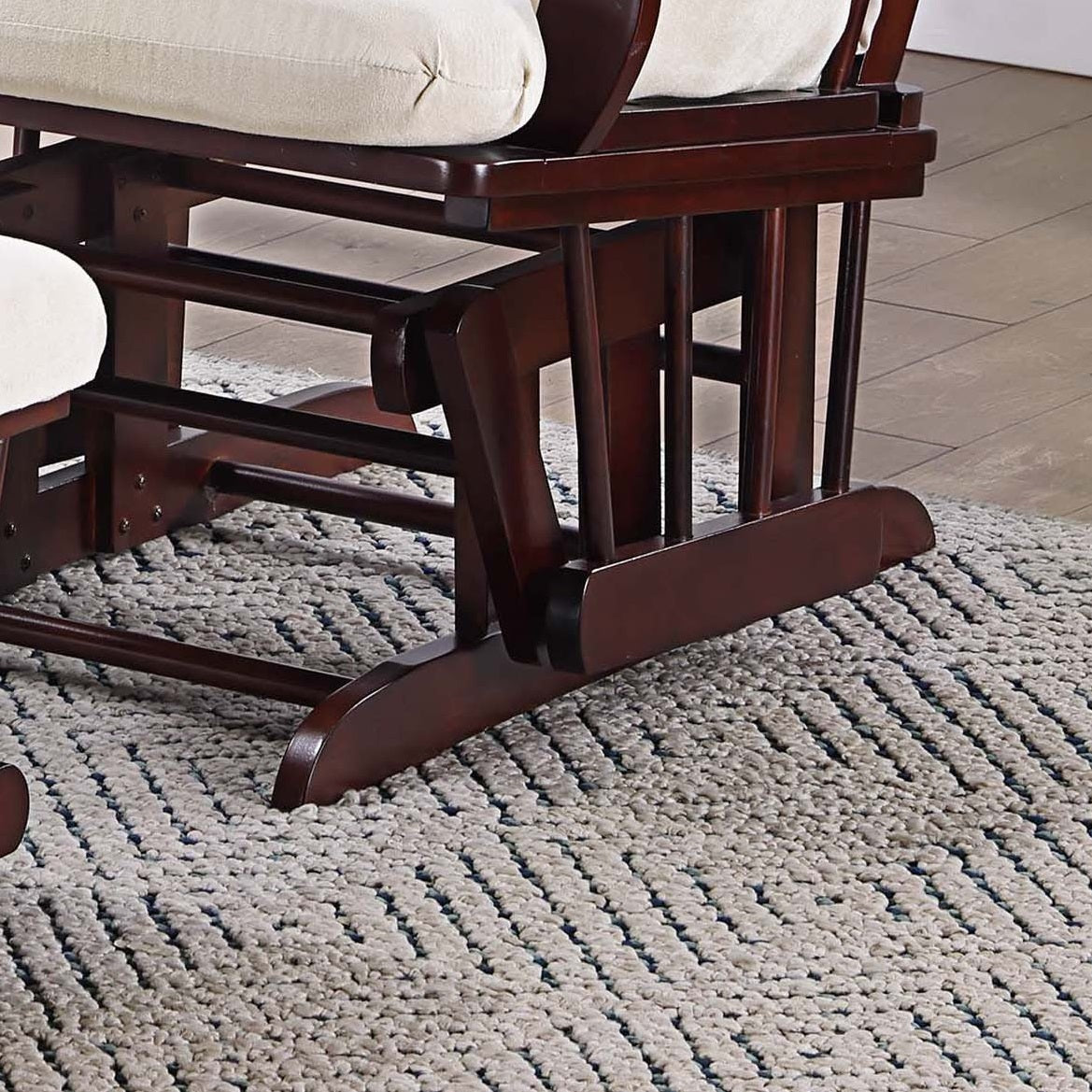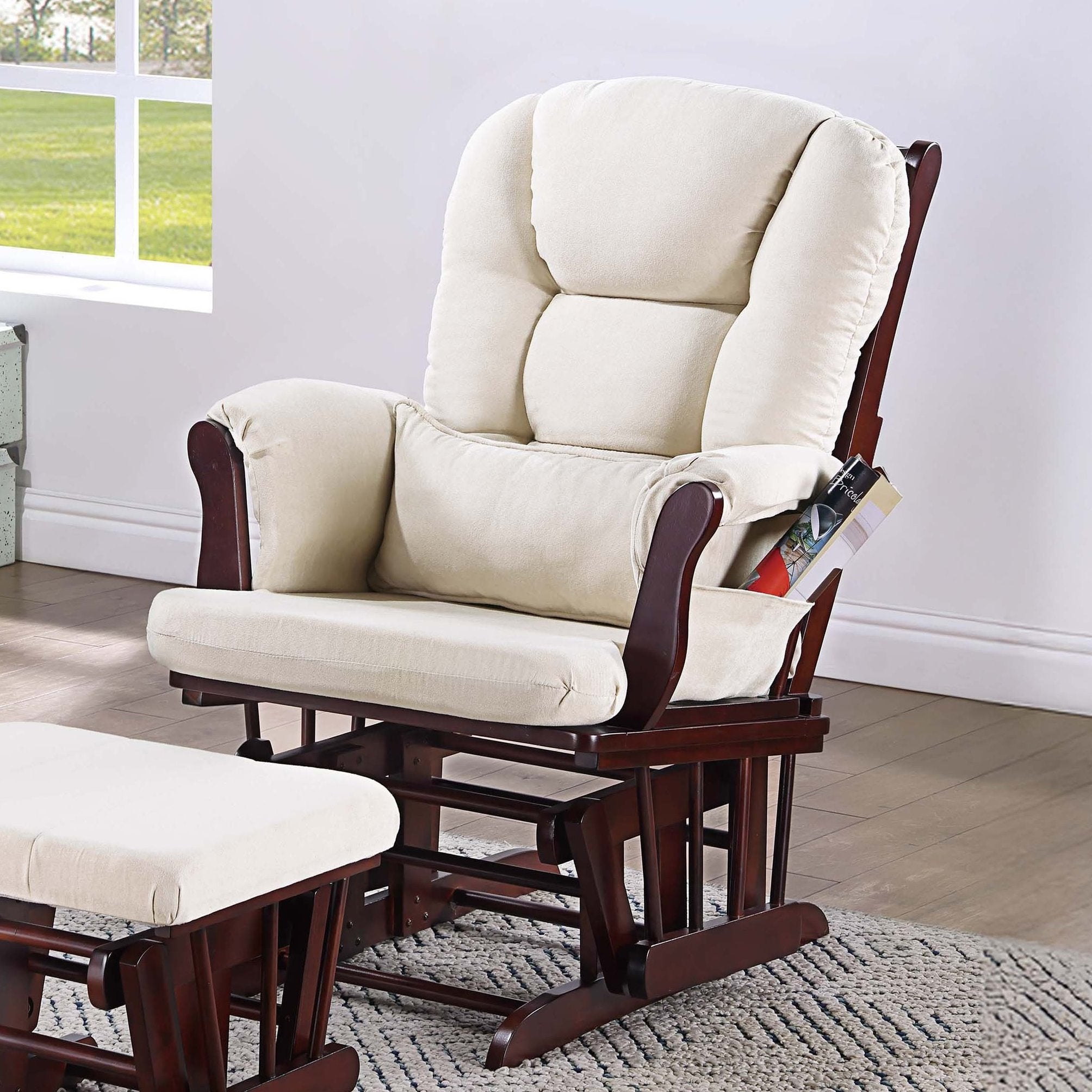 Sink into calm with this elegant upholstered glider chair and matching ottoman set, designed to elevate your relaxation moments with refined comfort and smooth gliding motion. Upholstered in soft beige microfiber over sturdy espresso-finished wood, the set blends cozy cushioning and practical features—like a built-in side pocket—for reading, nursing, or quiet lounging in living rooms, nurseries, or bedrooms.