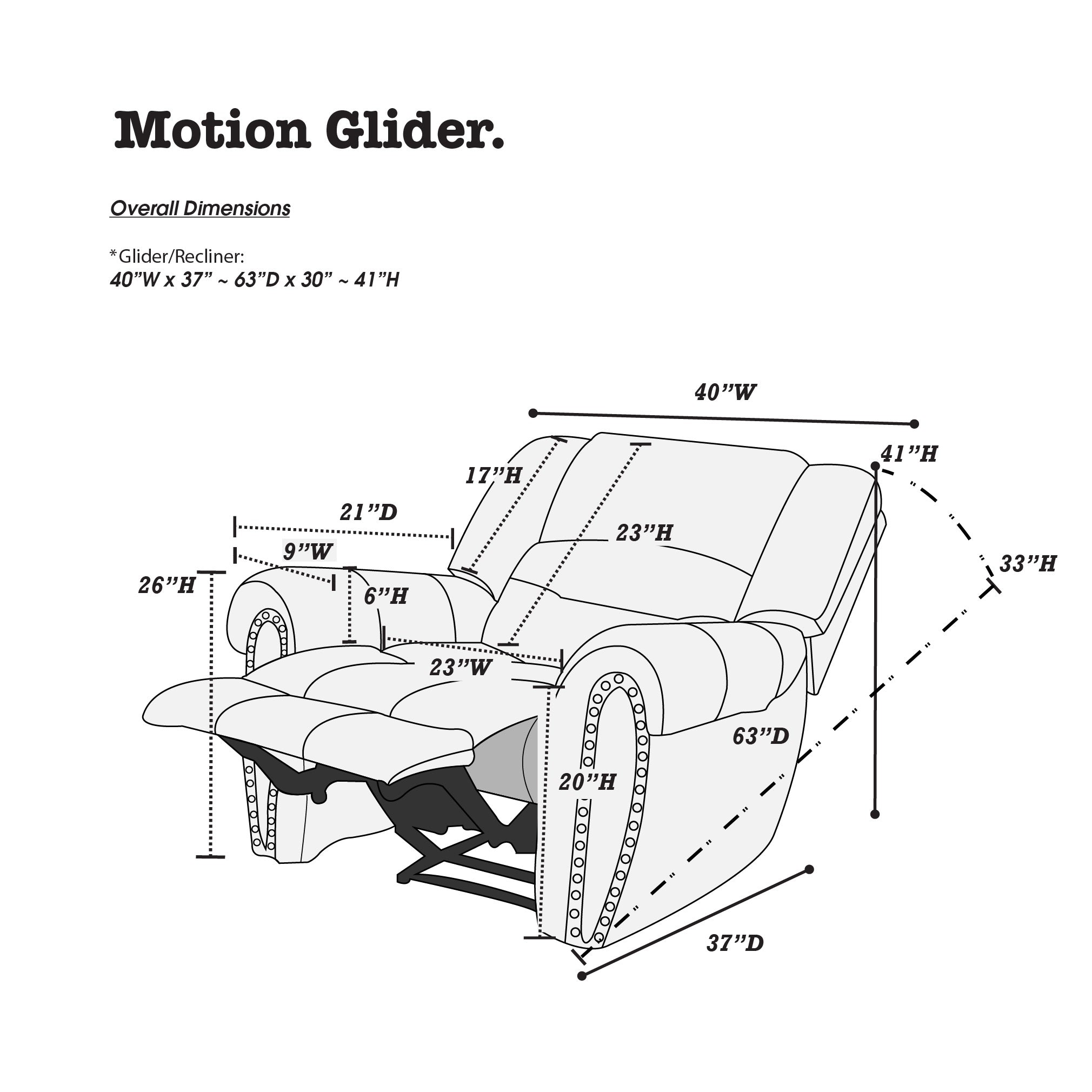 - Comfort & Design: Oversized plush cushioning, three-tiered lumbar-support backrest, cushioned armrests with decorative nailhead trim, and glider recline action for smooth, quiet movement.
