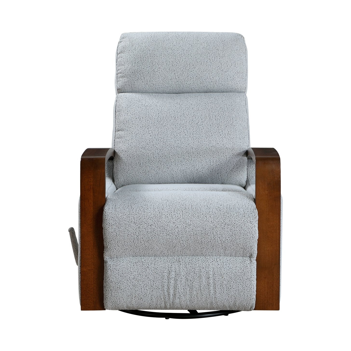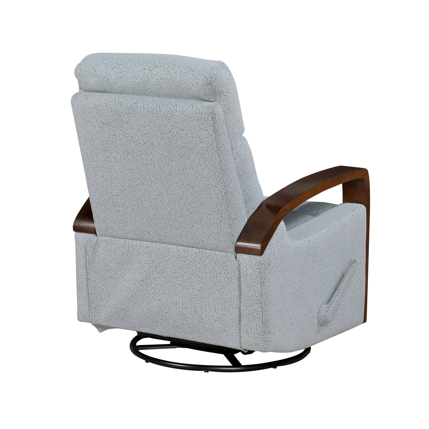 Sink into luxury with this swivel glider recliner, upholstered in soft gray boucle for a contemporary, cozy look. Designed for relaxation and style, the chair combines gentle gliding, smooth 360° swivel, and a full recline mechanism—perfect for living rooms, nurseries, or reading nooks. Rich brown-finished wooden arms and plush cushioning over pocket coils deliver lasting comfort and an elegant silhouette.