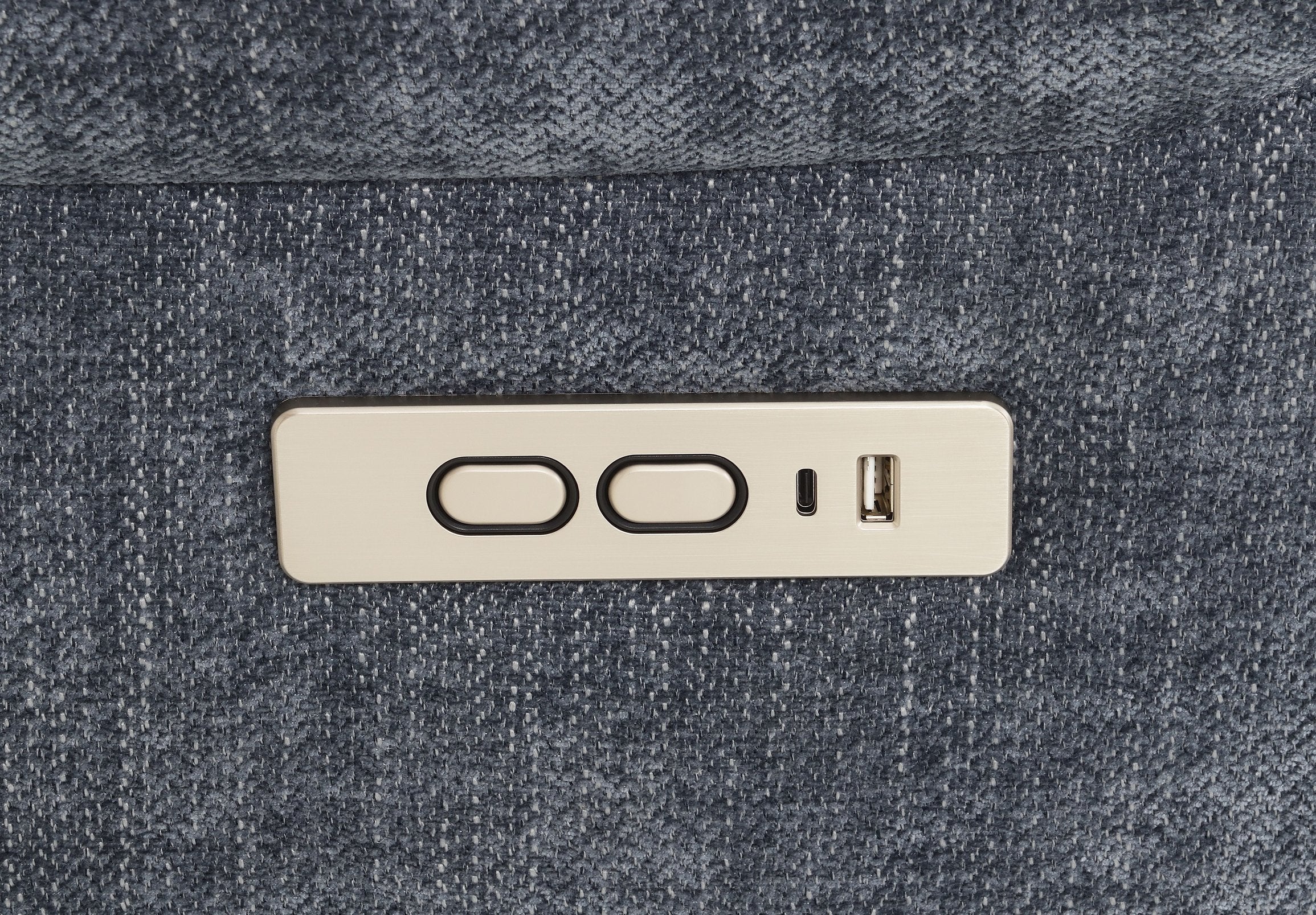 - This power motion recliner, upholstered in luxurious blue chenille, combines comfort and high-tech features, making it an excellent addition to any home.