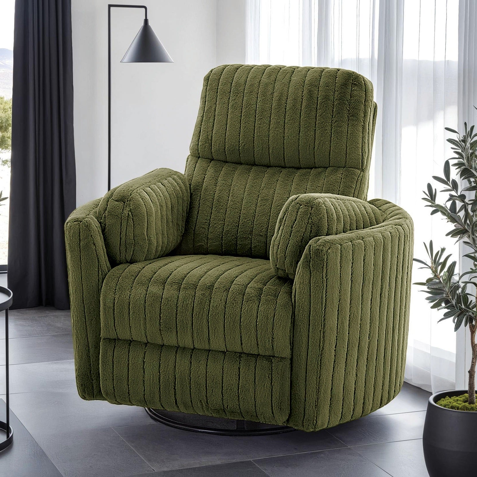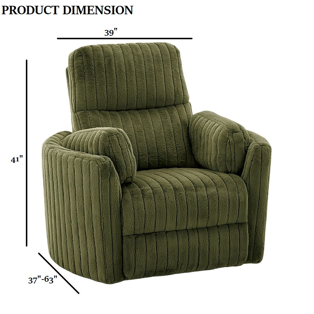 Invite comfort and contemporary style into your primary living room with this striking power glider recliner in dark teal. Plush pillow filling and curved swivel arms create an inviting silhouette while power reclining, gliding, and full 360° swivel deliver effortless, customizable relaxation. Crafted to be a standout accent piece, it pairs vibrant color with practical features for everyday usability.