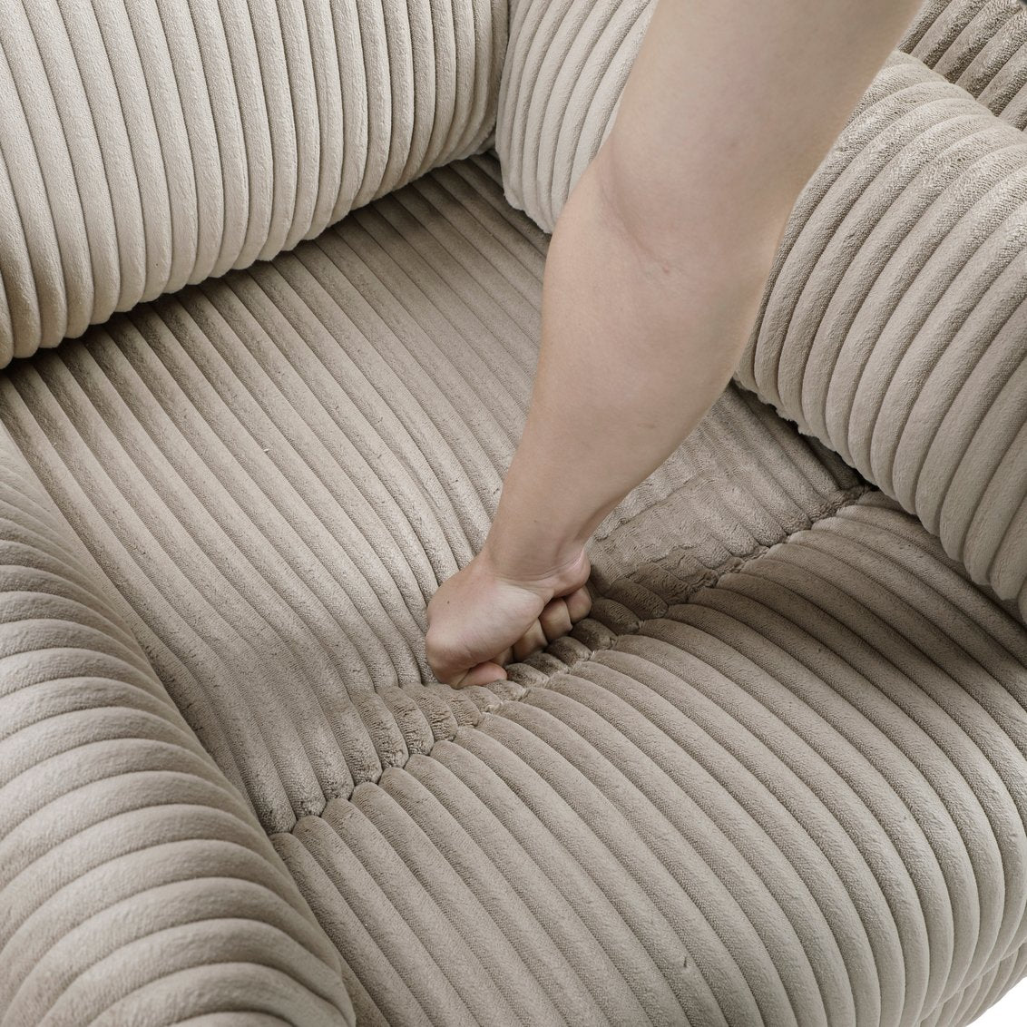 - Upholstery: Soft, textured taupe corduroy fabric that resists everyday wear while offering a cozy hand-feel.