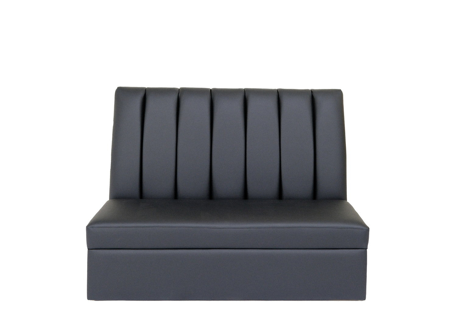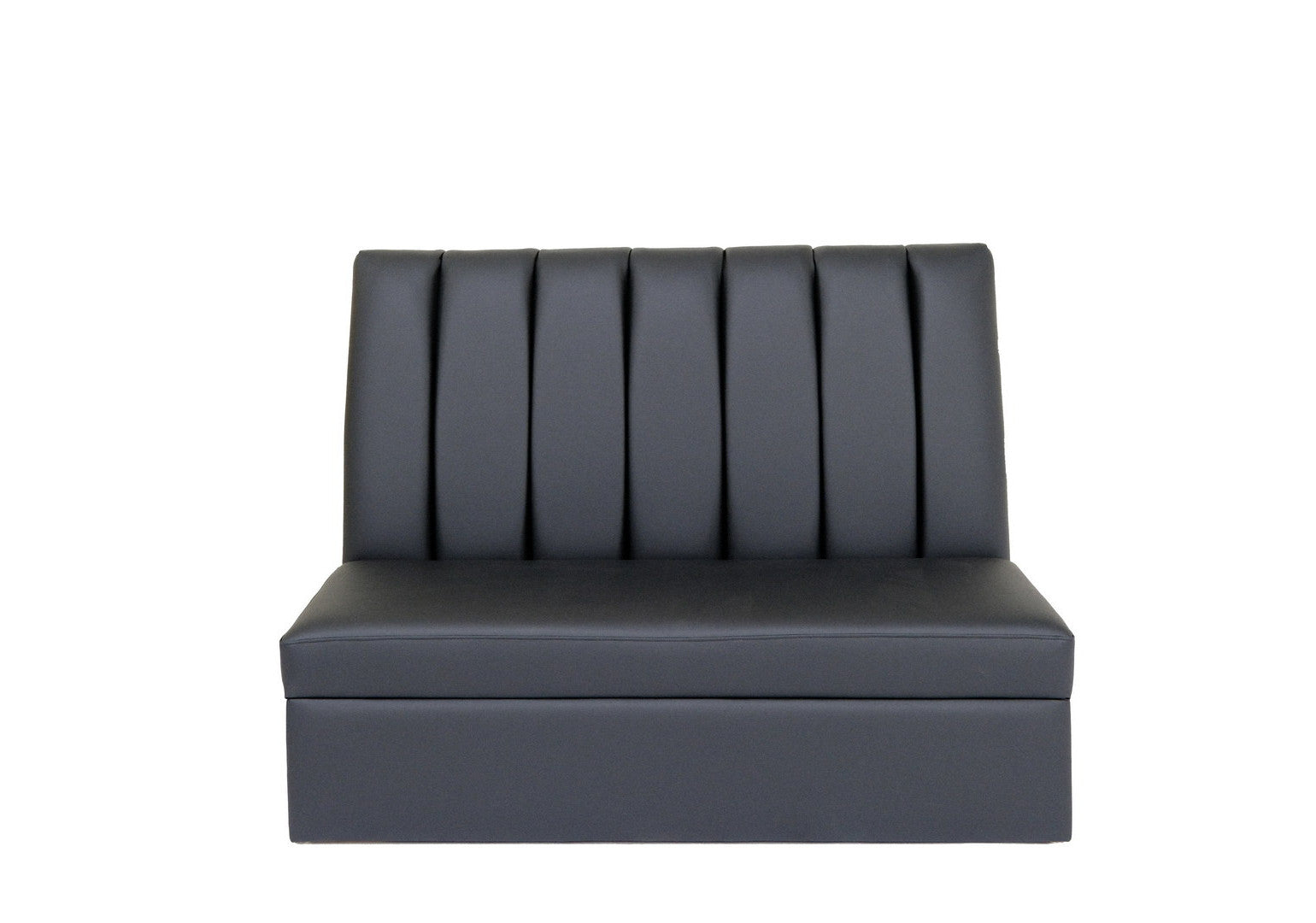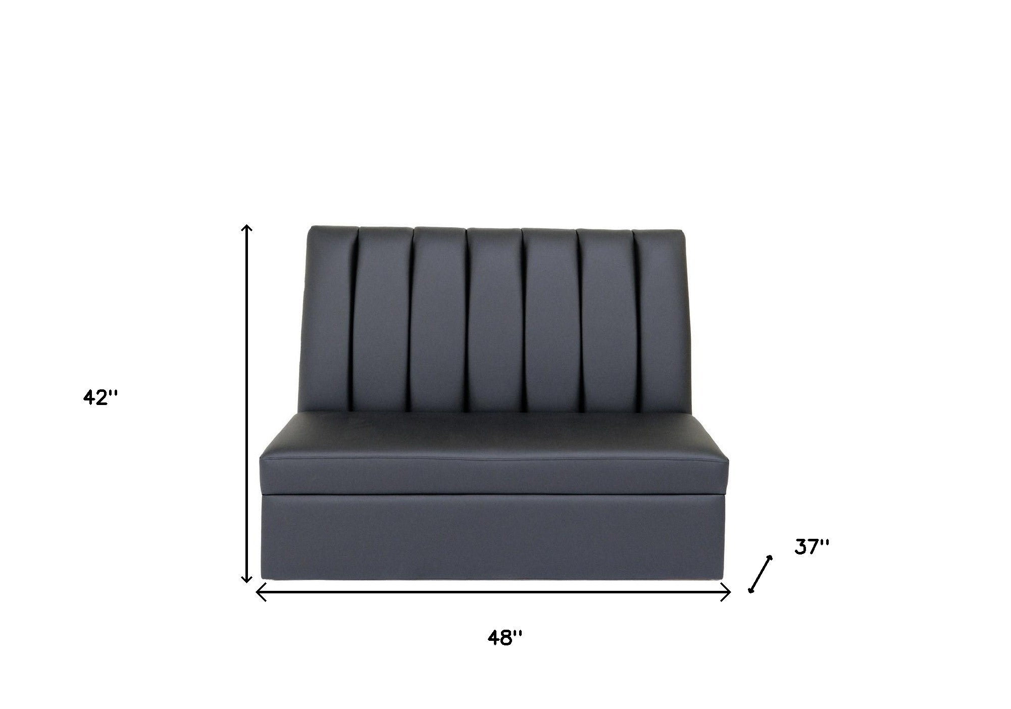 - Modern, armless, booth style faux leather loveseat with vertical channel stitched back.