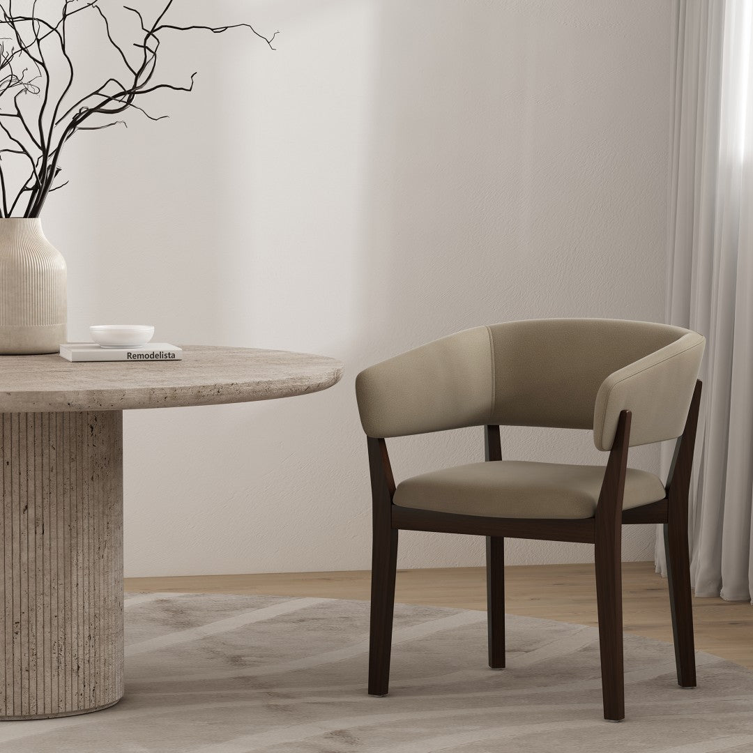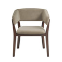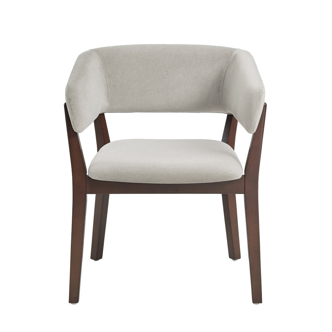 - ? Modern Dining Armchair for Dining Room and Task Use. ? Armchair Dimensions Measure: 26 in. Length, 32.7 in. Height, 22.8 in. Depth. ? Solid Beech Wood Frame Stained in Dark Walnut. ? Upholstered in Faux Mohair with Foam Padding for a Soft, Luxurious Feel. ? Angular Wraparound Backrest Offers Supportive, Ergonomic Comfort. ? Unique Sculptural Frame adds a Touch of Modern Design from Any Angle. ? Made to Last. Commercial Grade Product. ? Delivered to you Fully Assembled! No Assembly Required!