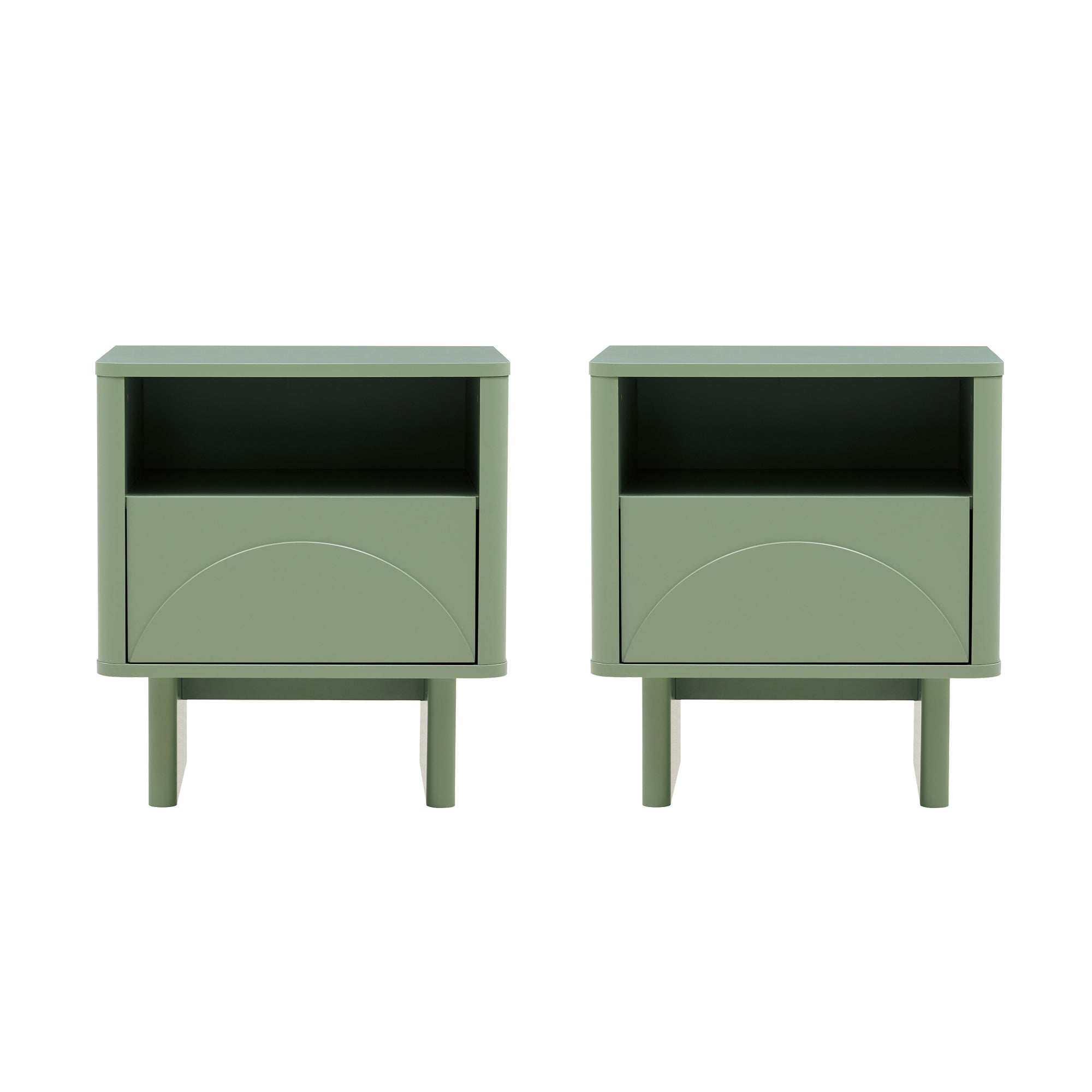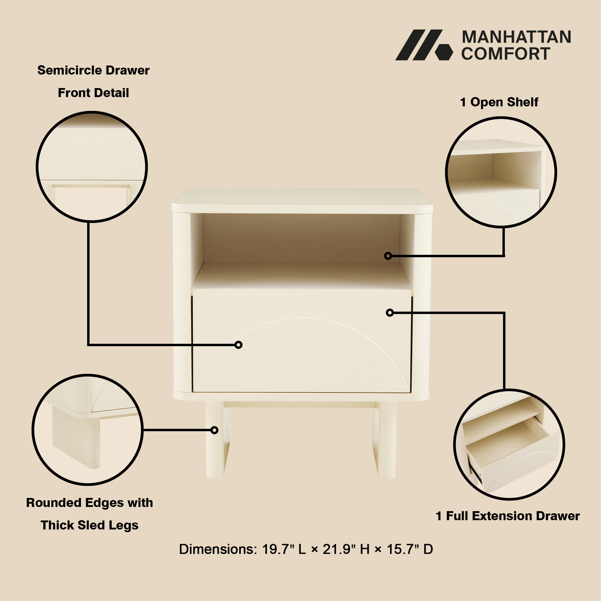 - Each Nightstand Includes 1 Open Shelf and 1 Full Extension Drawer with a Raised Semicircle Front Design.