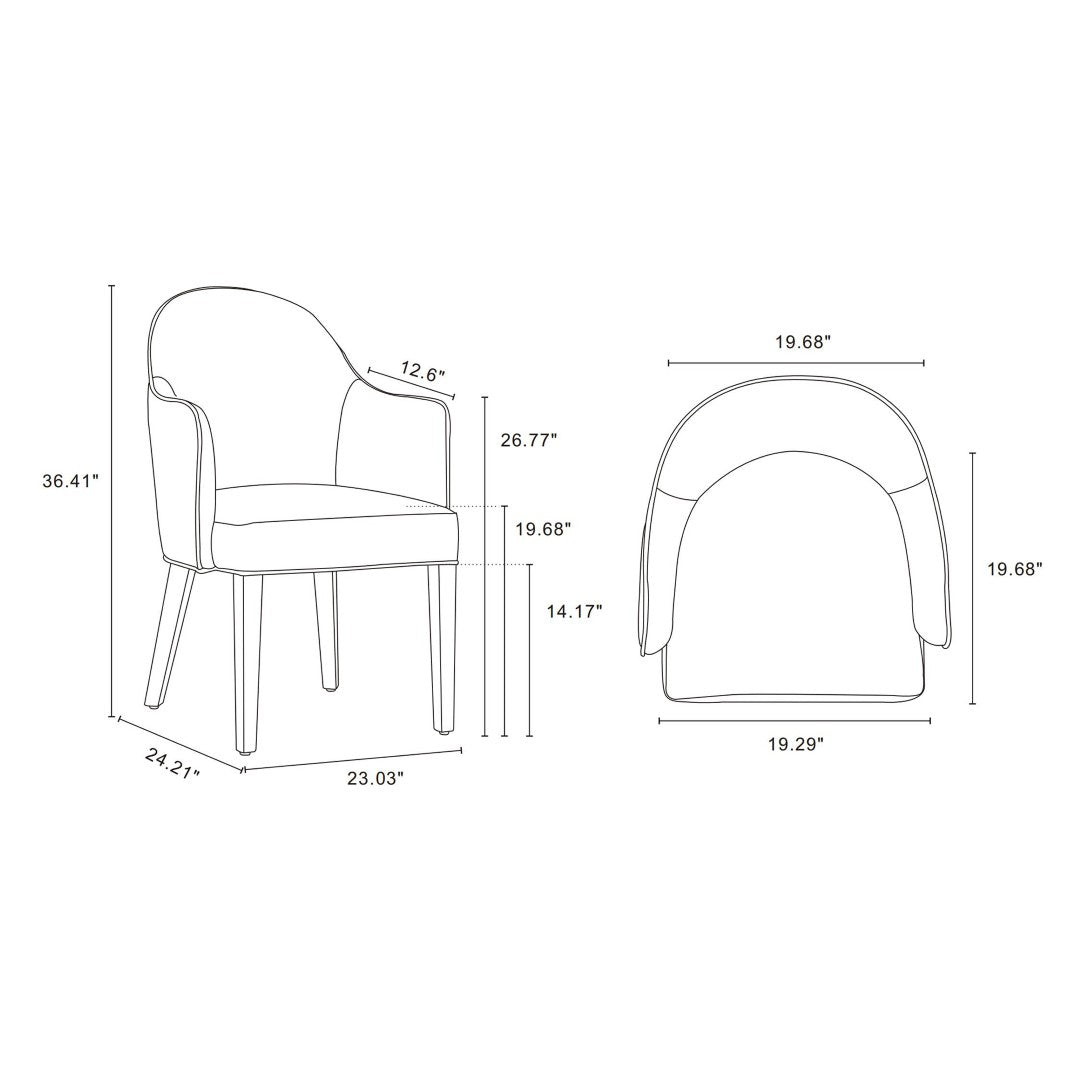 - ? Modern Dining Arm Chair for Dining Room and Task Use. ? Armchair Dimensions Measure: 23.03 in. Length, 36.41 in. Height, 24.21 in. Depth. ? Solid Beech Wood Frame Stained in Black. ? Upholstered in 2 Textured Luxurious Leatherette Front and Velvet Back with Foam Padding. ? Weight Capacity: 330 Lbs. Each. ? Seat Height: 19.68 in. ? Made to Last. Commercial Grade Product. ? Delivered to you Fully Assembled! No Assembly Required!