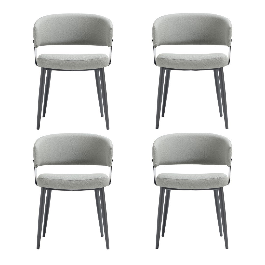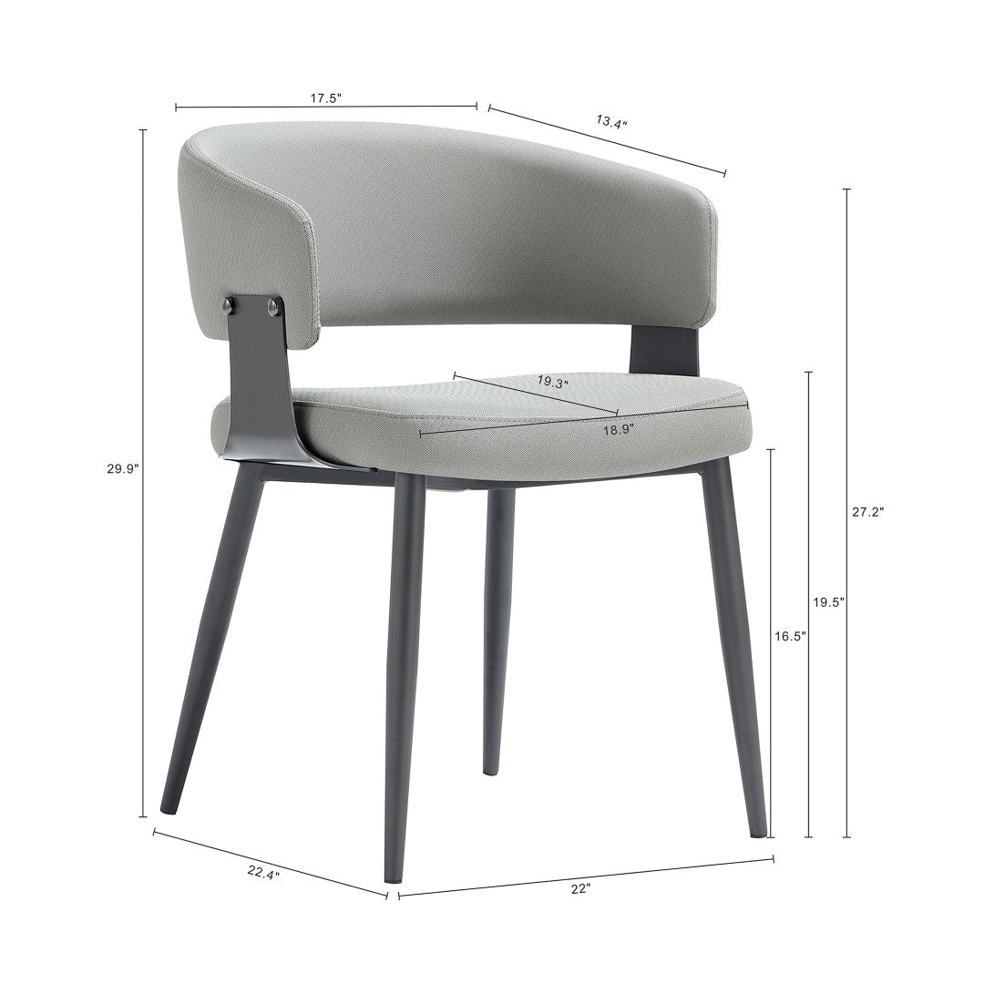 - ? Modern Dining Chair for Dining Room and Task Use. Set of 4. ? Upon assembly, Dining Chair Dimensions Measure: 22 in. Length, 29.9 in. Height, 22.4 in. Depth. ? Upholstered in Luxurious Textured Leatherette with Fine Stitching. ? Grey Metal Frame Adds Strength and a Sleek, Modern Finish. ? Curved Wraparound Open Backrest Provides Ergonomic Support. ? Plush, Foam-Filled Seat for Lasting Comfort. ? Made to Last. Commercial Grade Product. ? Home Assembly Required. All Hardware Included