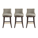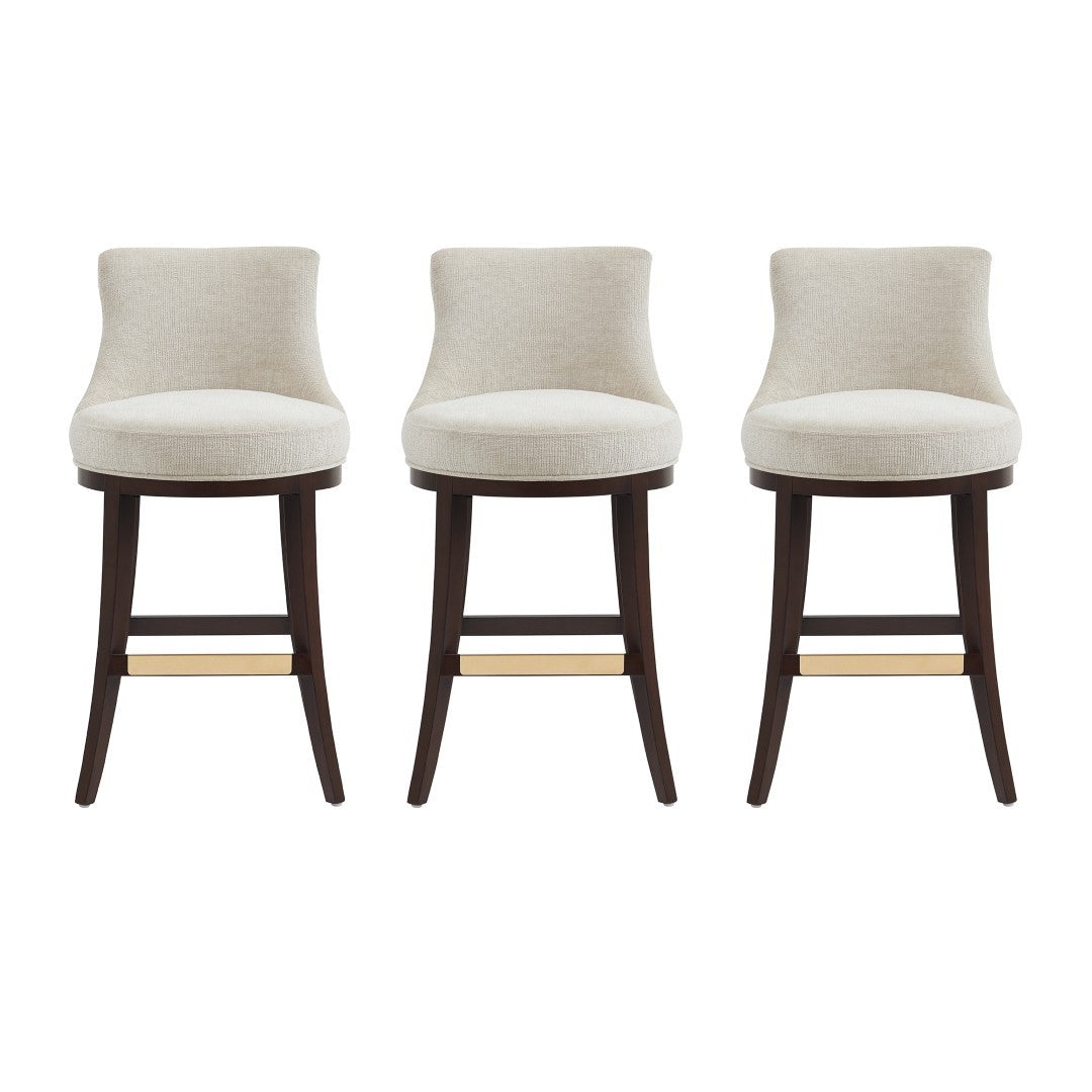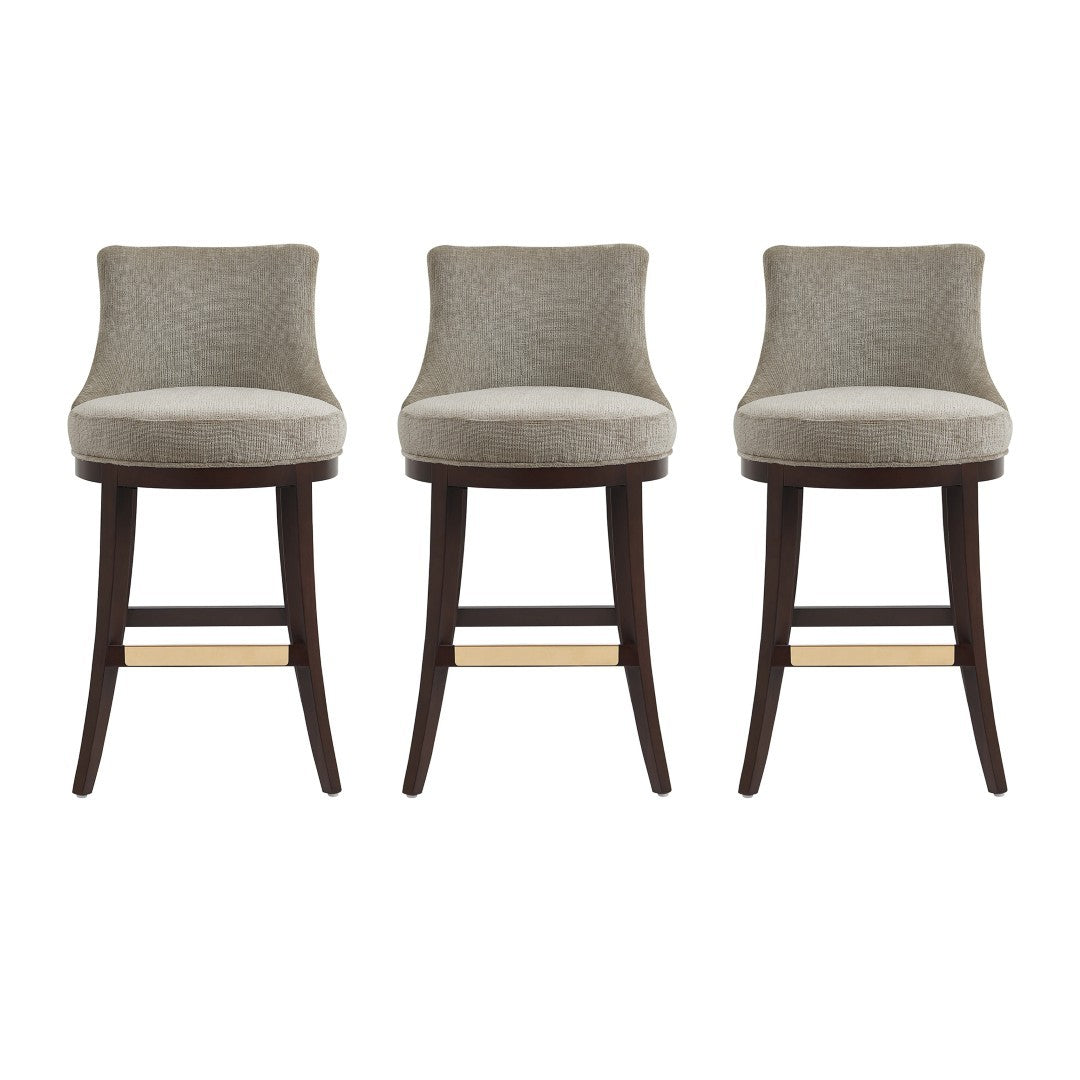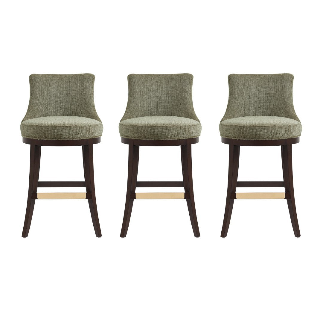 - ? Modern Barstool with Backrest Perfect for Bar and Kitchen Use. Set of 3. ? Barstool Dimensions Measure: 20.9 in. Length, 40.2 in. Height, 23 in. Depth. ? Upholstered in Luxurious Textured Chenille. ? Features a Gracefully Curved Backrest for Ergonomic Support and Visual Appeal. ? Solid Beech Wood Frame Stained in Dark Walnut. ? Includes Footrest with Gold Metal Plate for a Touch of Elegance with Comfort. ? Made to Last. Commercial Grade Product. ? Delivered to you Fully Assembled! No Assembly Required!