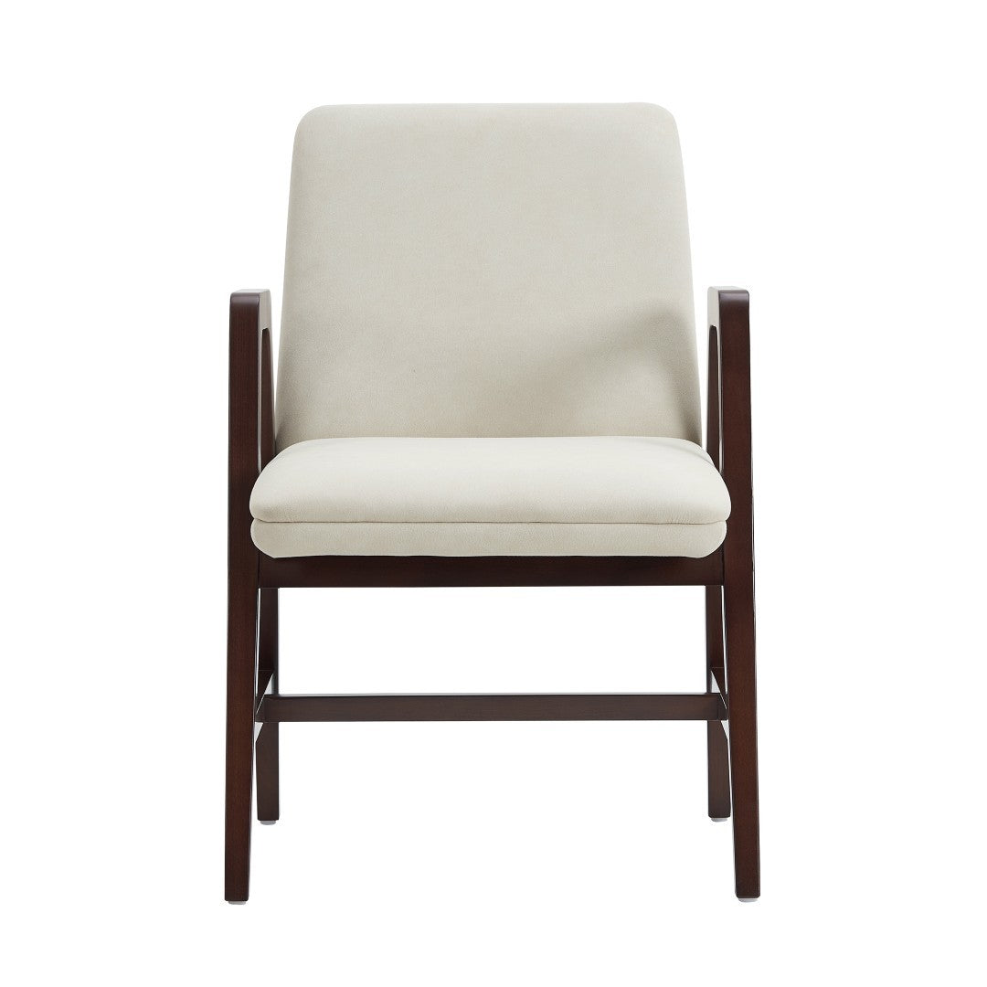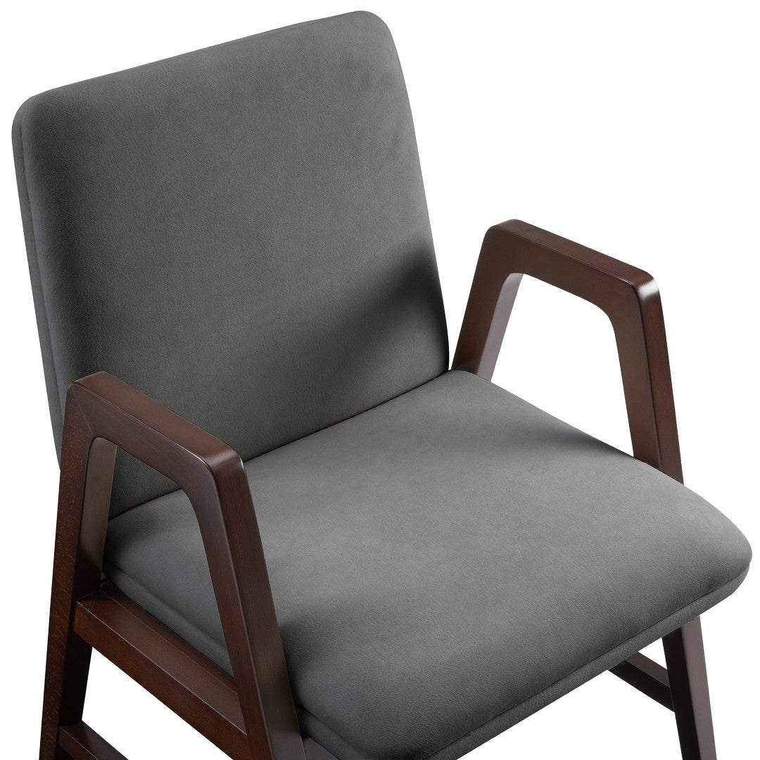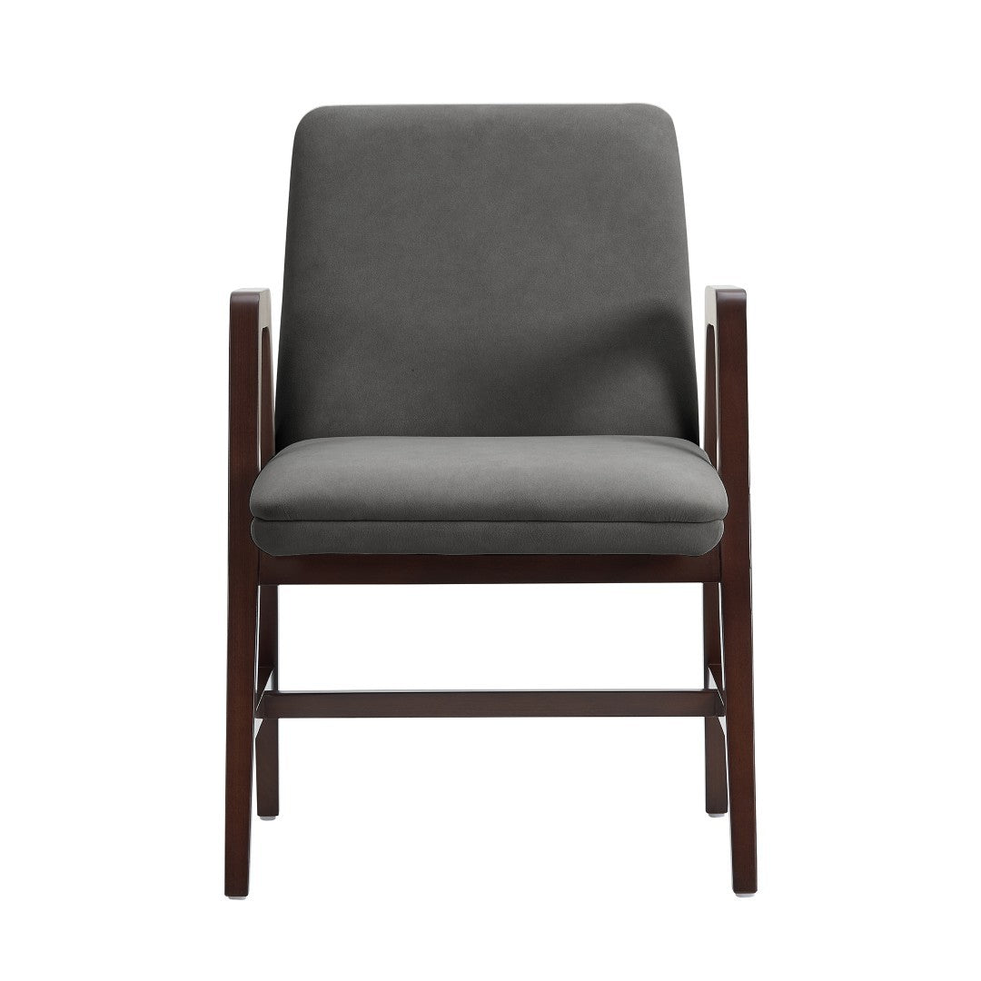 - ? Modern Dining Armchair for Dining Room and Task Use. ? Armchair Dimensions Measure: 22.8 in. Length, 34.3 in. Height, 25 in. Depth. ? Sculptural Open Frame with Arms Crafted From Solid Beech Wood. ? Rich Dark Walnut Frame Complements a Range of Interior Styles. ? Upholstered in Soft Velvet for a Luxurious, Tactile Finish. ? A-line Leg Design with Stretcher Bars Adds Durability and Visual Balance. ? Made to Last. Commercial Grade Product. ? Delivered to you Fully Assembled! No Assembly Required!