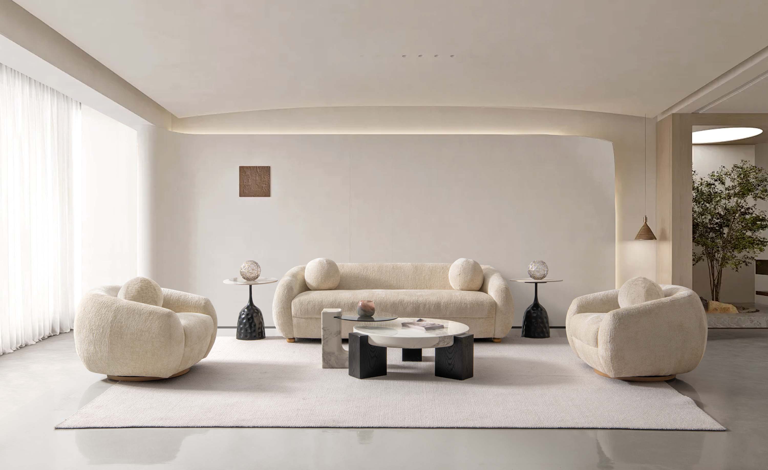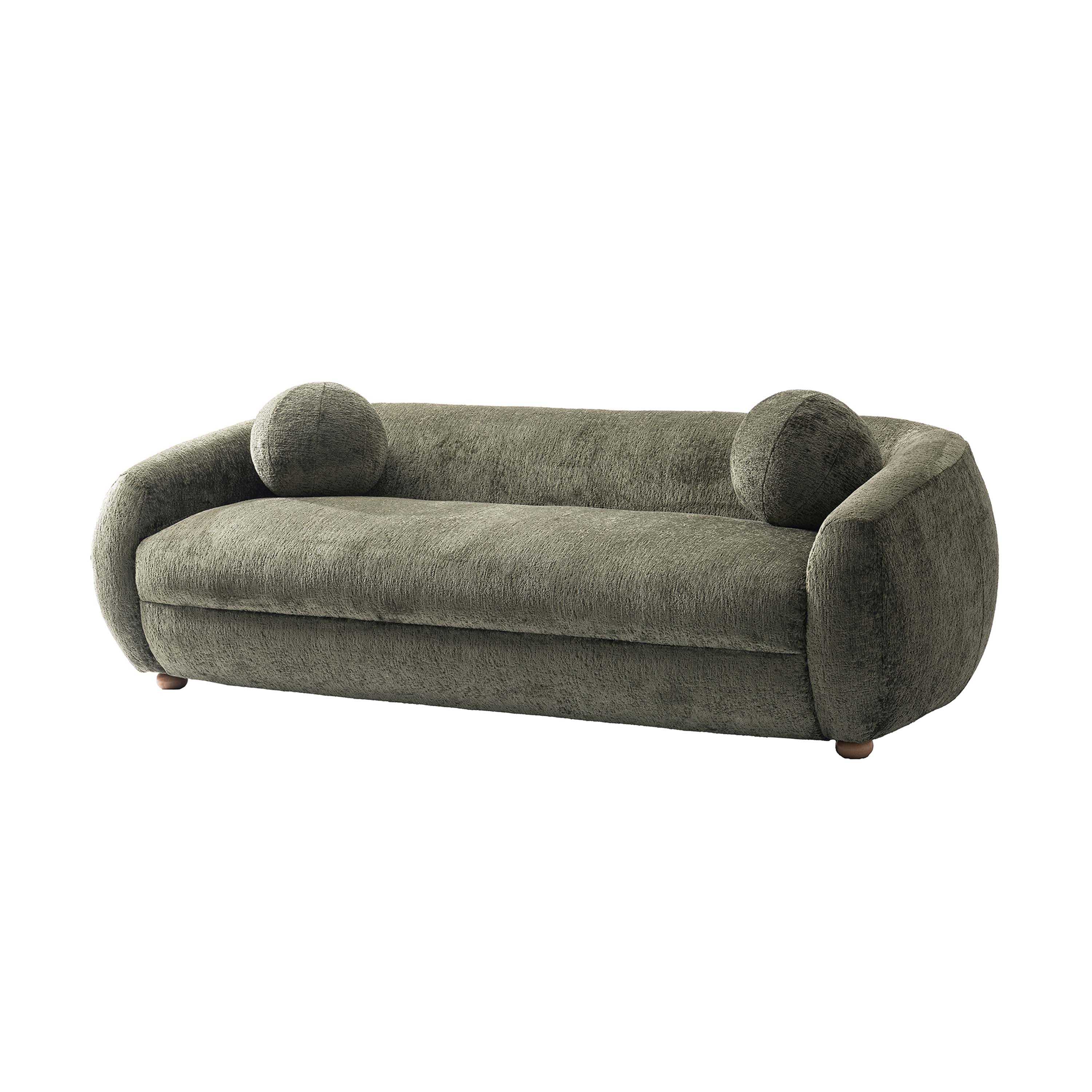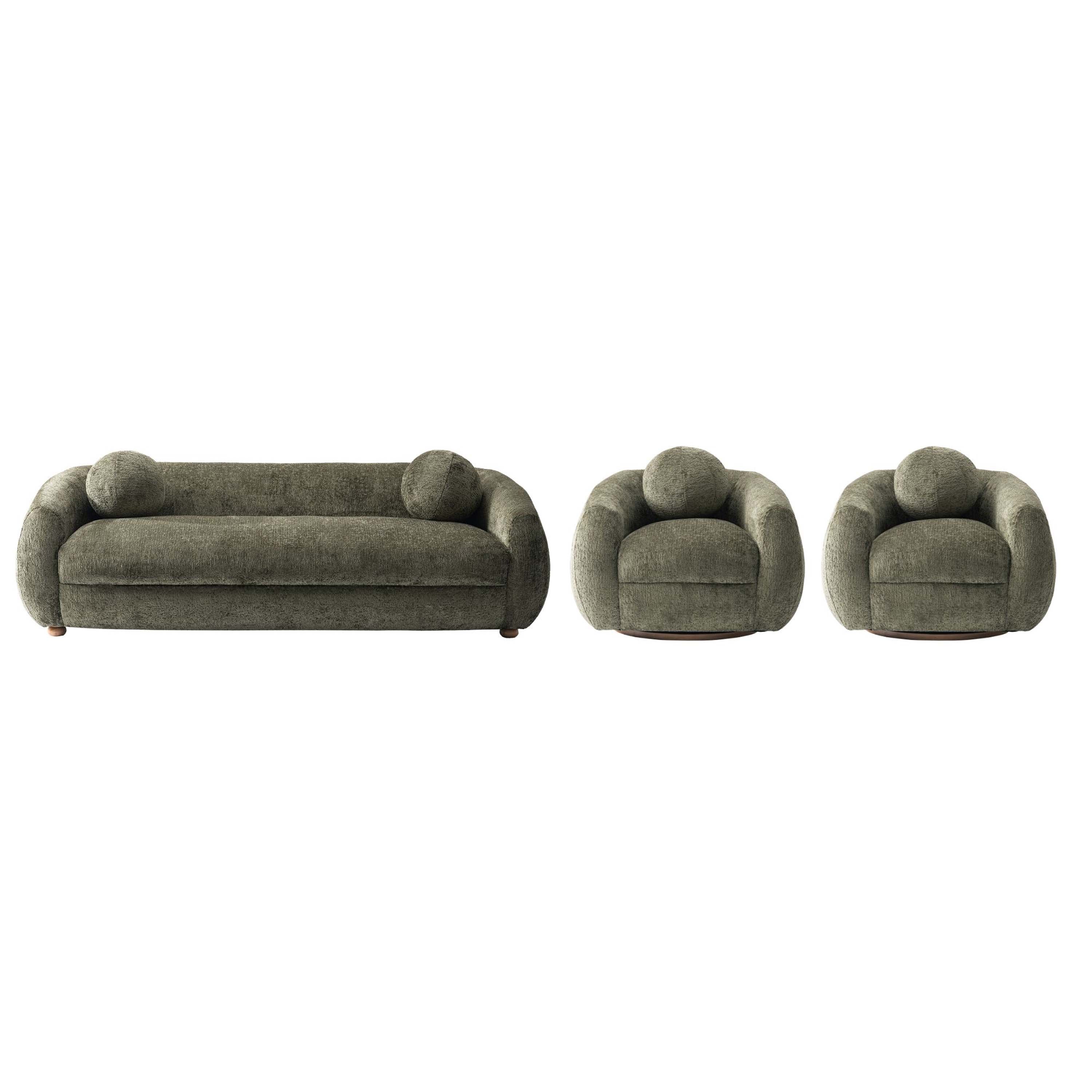 Introducing the Tribeca collection, where sophistication meets modern comfort. Upholstered in plush chenille, the collection boasts a sleek, rounded design that exudes contemporary elegance. Adorned with stylish sphere accent pillows, each piece offers a perfect blend of luxury and chic appeal, ideal for creating a cozy and fashionable living space.- Modern Glam Sofa and Swivel Accent Chairs for Living Room Usage. Set of 3.