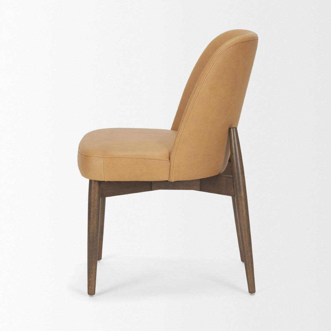 Elevate your dining room with a sculpted, modern classic that blends comfort and streamlined design. The Abbie chair pairs a wraparound sloped back with tapered legs and rich tan leather upholstery for a look that’s both refined and relaxed—ideal for everyday dining or formal gatherings.