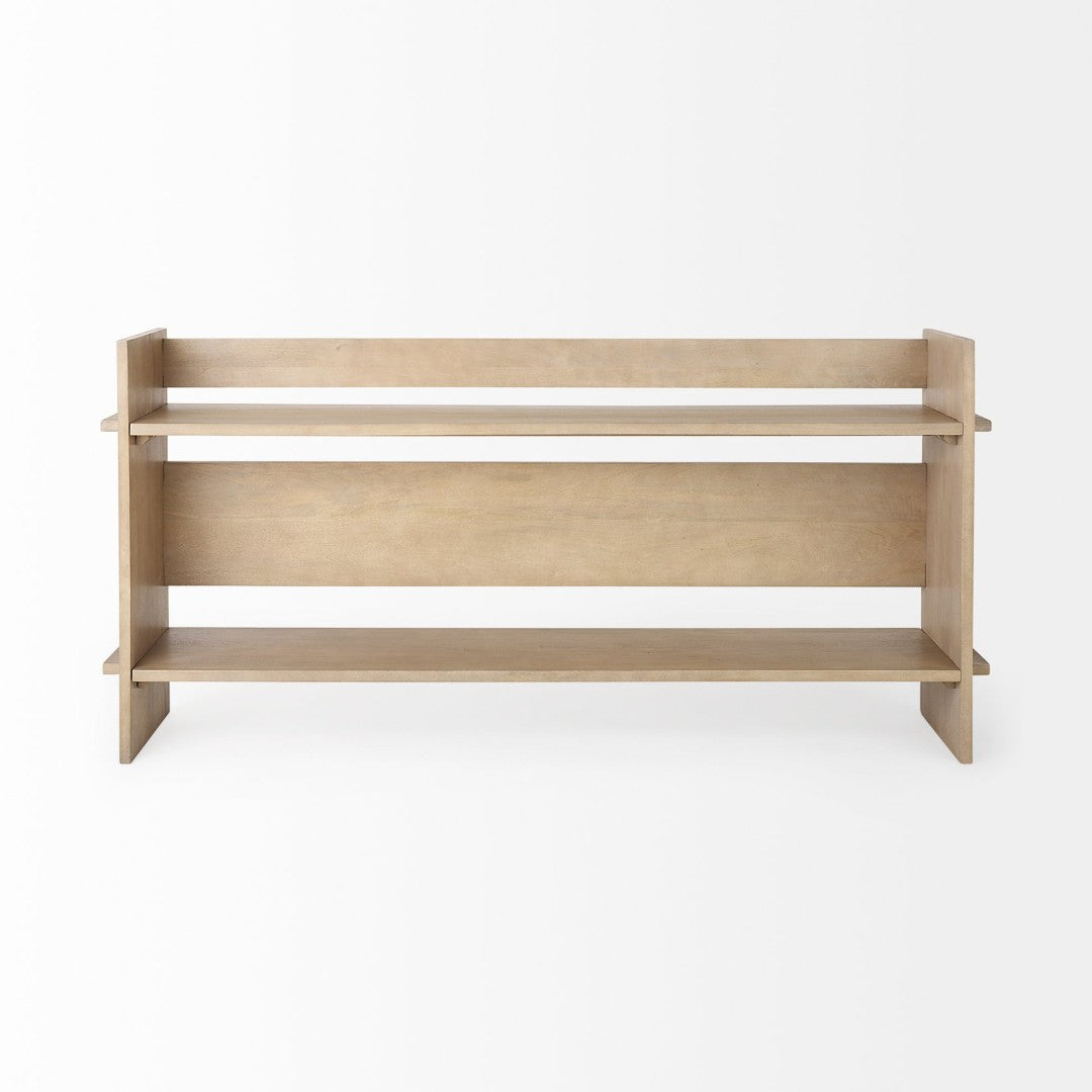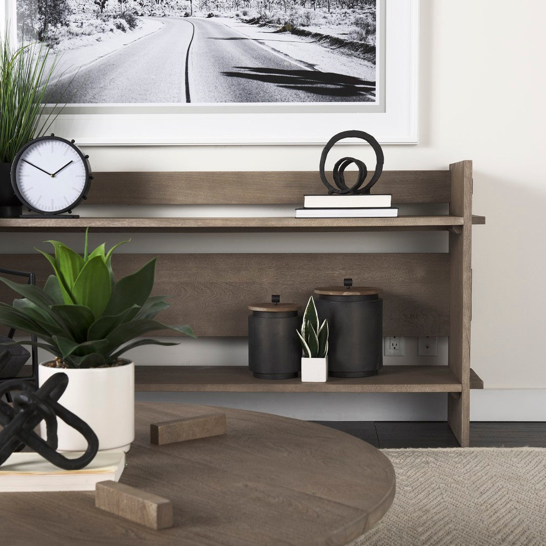 - The console table features wide plank sides with shelves and back beams that protrude through making this display piece unique and sturdy.