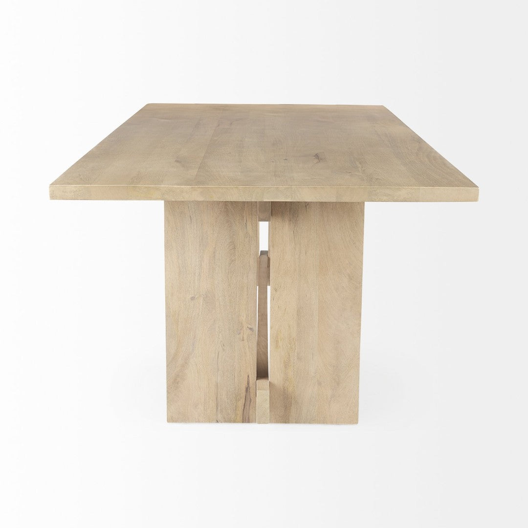 - The Aida is a sturdy wooden dining table featuring four wide legs which are connected with one long beam in the middle for ample support.