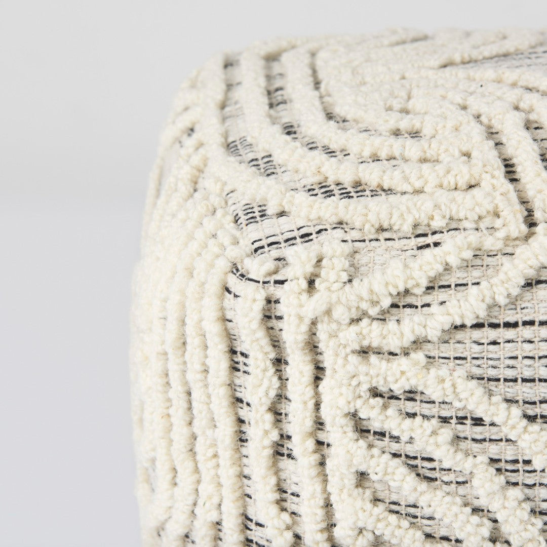 Add a touch of understated elegance and versatile functionality to any room with this handcrafted wool and cotton pouf. Designed for comfort and visual interest, its neutral cream, gray, and black palette and refined patterning complement contemporary, coastal, and global interiors while serving as extra seating, a footrest, or an accent piece.