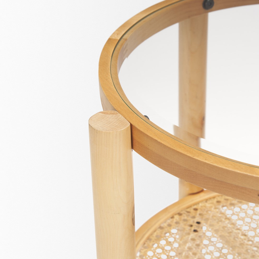- Materials: Solid birch wood frame for durability, natural woven cane lower shelf for texture, and a smooth clear glass tabletop for easy cleaning