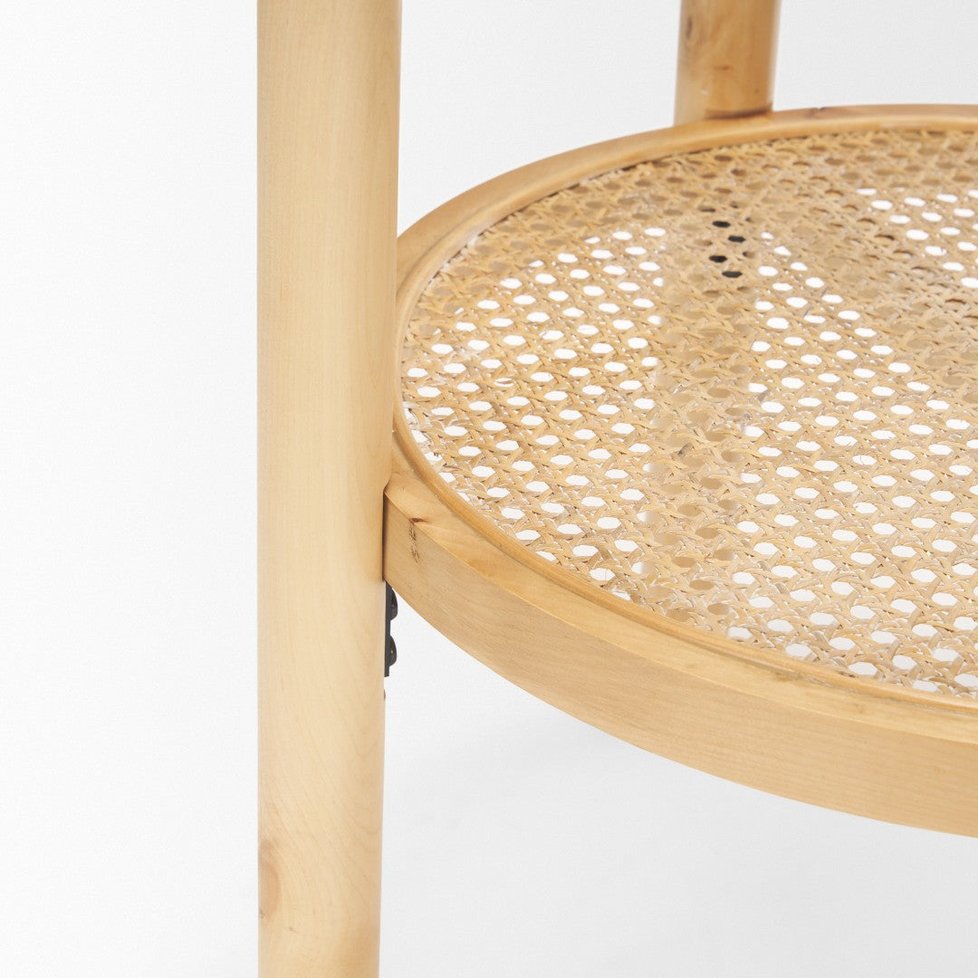 - Design: Round silhouette with light brown finish and open cane shelf delivers a breezy, coastal-inspired aesthetic