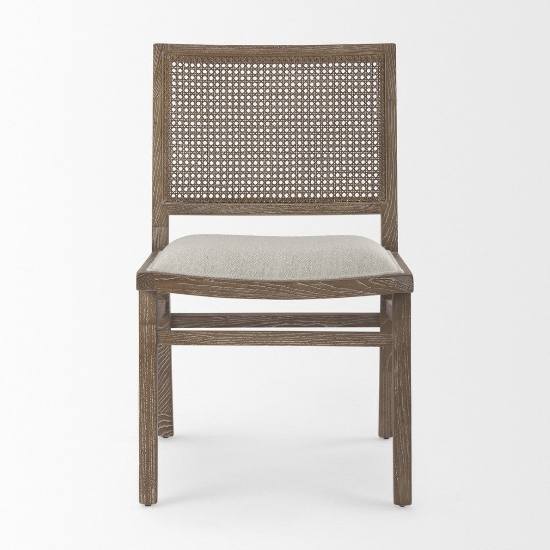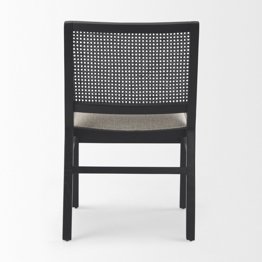 This contemporary dining chair blends clean lines, tactile materials, and neutral tones for a refined yet comfortable dining experience. The cushioned beige seat and woven cane backing provide visual contrast and breathability, while the solid wood frame in jet-black ensures lasting stability and a polished look that complements a variety of interior styles.